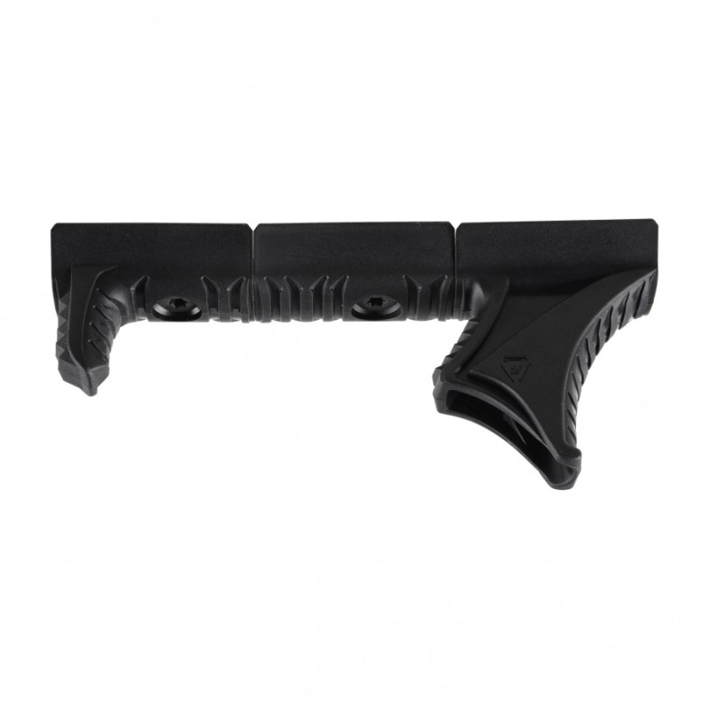 Chwyt przedni Strike Industries LINK to lekkie, wytrzymałe polimerowe akcesorium ułatwiające operowanie bronią. Wyposażone jest w system mocowania Link Key, który umożliwia jego zainstalowanie na szynach typu M-LOK oraz KeyMod. Konstrukcja chwytu wspiera różne techniki manipulacji bronią, dostosowane do preferencji użytkownika i wykonywanych zadań. Ergonomiczny kształt oraz liczne wyżłobienia pod palce umożliwiają pewny i komfortowy chwyt. W zestawie znajdują się śruby montażowe i klucz imbusowy. Model jest w czarnym kolorze.