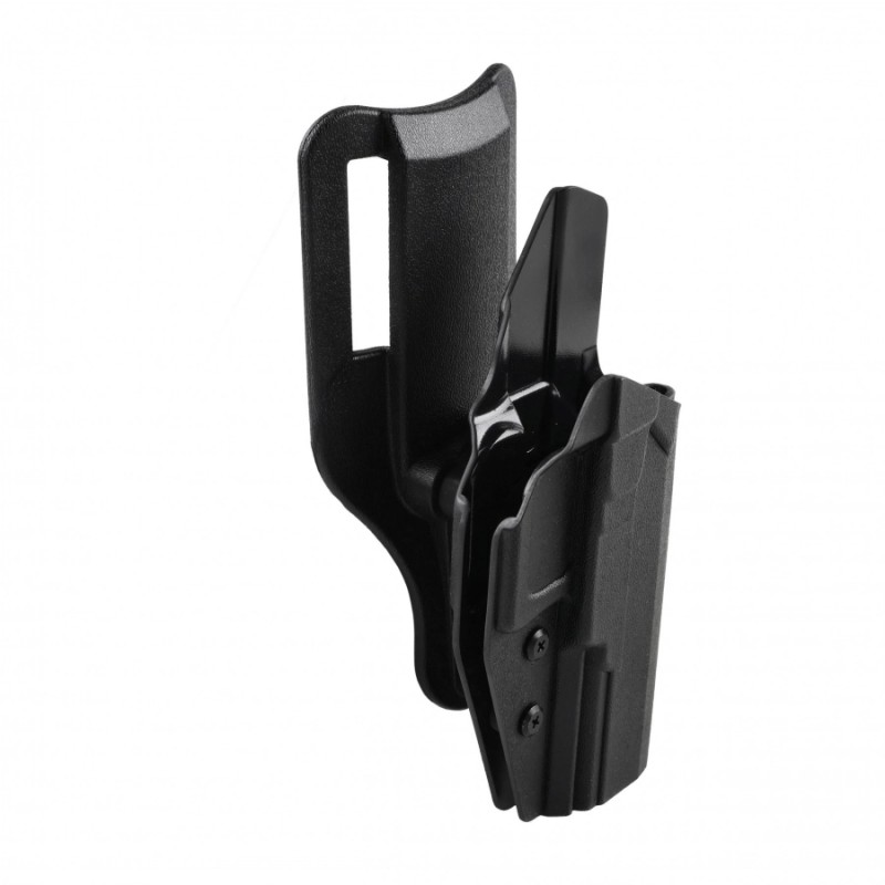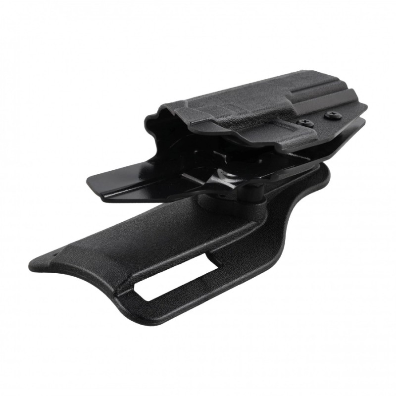 Kabura montowana jest na przelotowej, obniżonej platformie Mid-Ride, która umożliwia łatwe mocowanie na pasie taktycznym o szerokości do 45 mm. Obniżenie i przesunięcie broni na bok pozwala na pewne i bezpieczne dobycie, a jednocześnie zapewnia, że pistolet nie koliduje z kamizelką, nawet podczas dynamicznego ruchu.