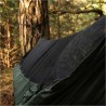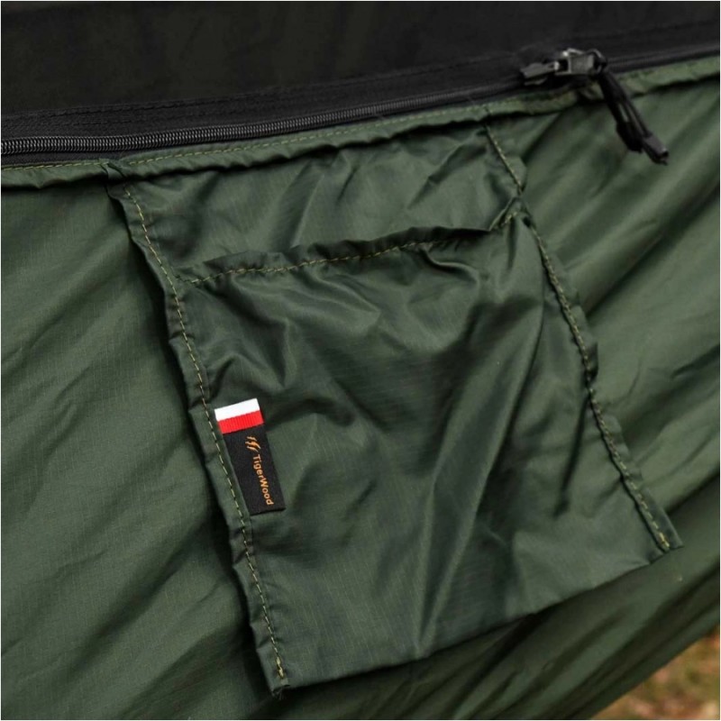 Hamak TigerWood Ważka V2 wykorzystuje wzmocnioną siatką ripstop tkaninę nylonową, gwarantującą te same korzyści wsparte zwiększoną odpornością na uszkodzenia. Materiał charakteryzuje się wysoką odpornością na rozciąganie, dzięki czemu bez problemu utrzyma ciężar do 275 kg. Charakteryzuje się przy tym niską masą oraz dobrą oddychalnością, dzięki czemu będzie komfortowy zarówno w transporcie jak i podczas użytkowania. Umieszczona na boku hamaka kieszonka umożliwi przechowanie pod ręką kluczowych akcesoriów. Zintegrowana moskitiera została natomiast wyposażona w cięciwy, które pozwalają na jej odpowiednie napięcie dla komfortu użytkownika.