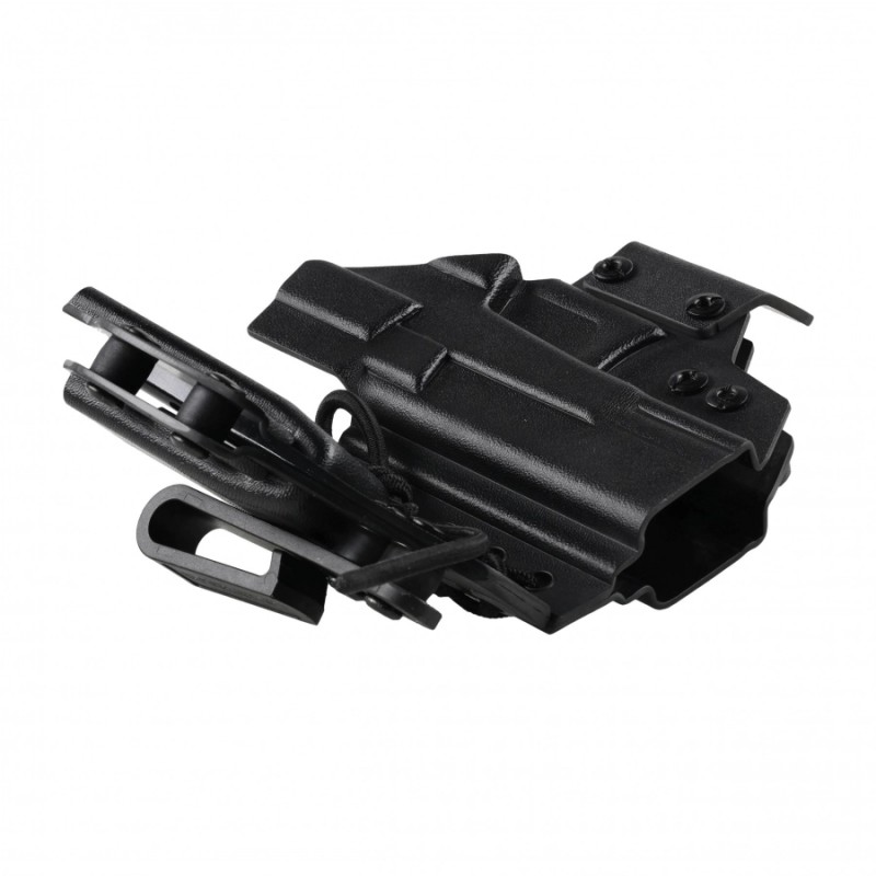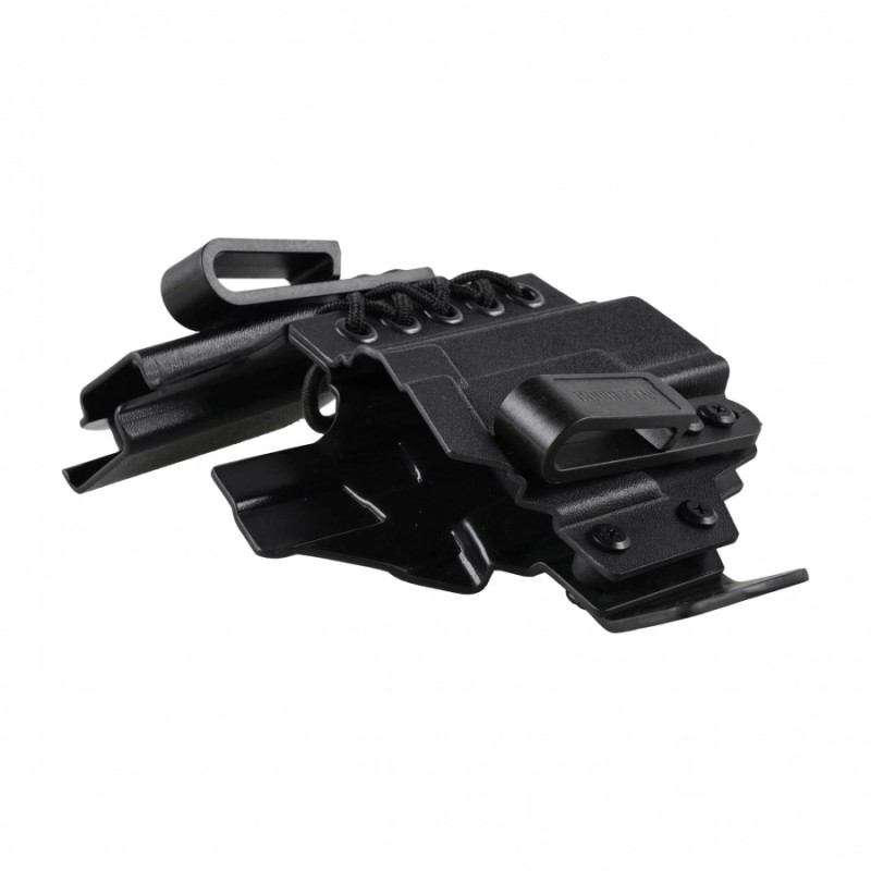 Mocowanie odbywa się za pomocą dwóch regulowanych klipsów z tworzywa o szerokości do 43 mm, które można dostosować do sylwetki oraz noszonego pasa taktycznego.
