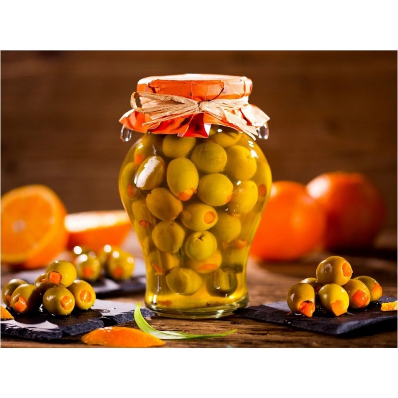 Oliwki Manzanilla nadziewane pomarańczą 300 g mają pobudzający cytrusowy smak, dlatego najlepiej sprawdzą się jako lekka przekąska podczas upalnego lata.