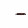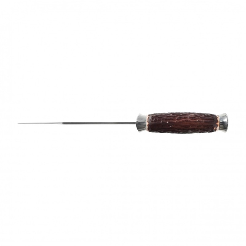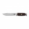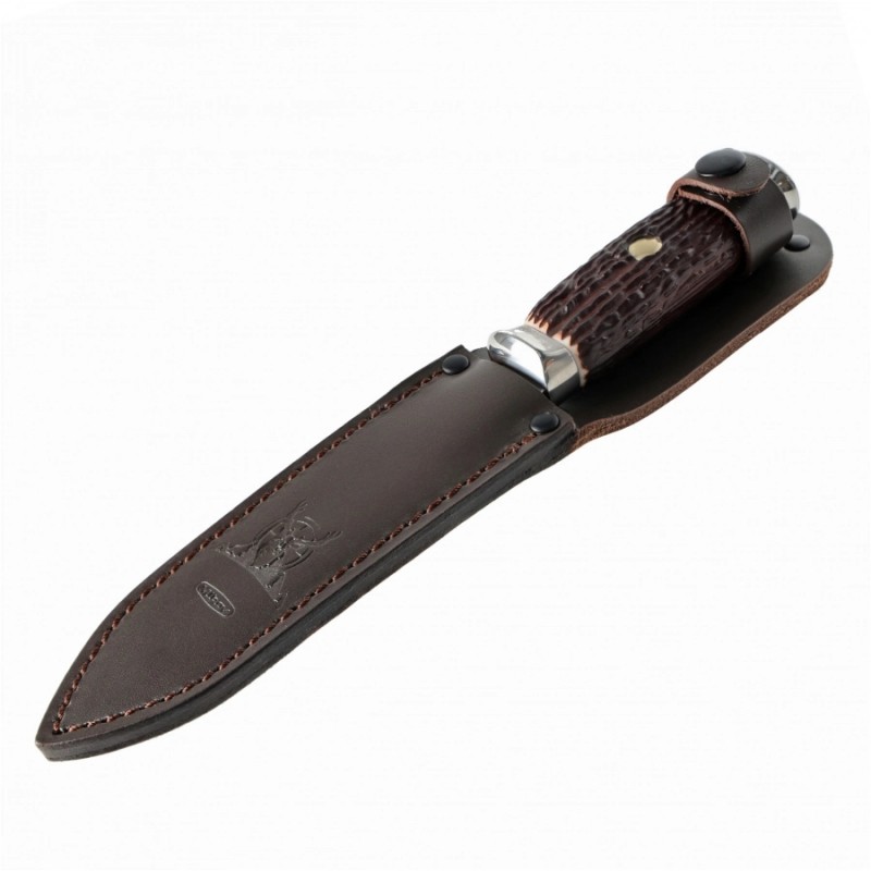 Skaut Venado ma stylową rękojeść z polimeru, wiernie imitującej poroże jelenia. Klasyczny charakter noża podkreślają metalowe okucia, które poprawiają chwyt i zapobiegają wyślizgiwaniu się noża z dłoni. Do przenoszenia noża przy pasie służy pochewka z naturalne skóry, zapinana na metalową napę.