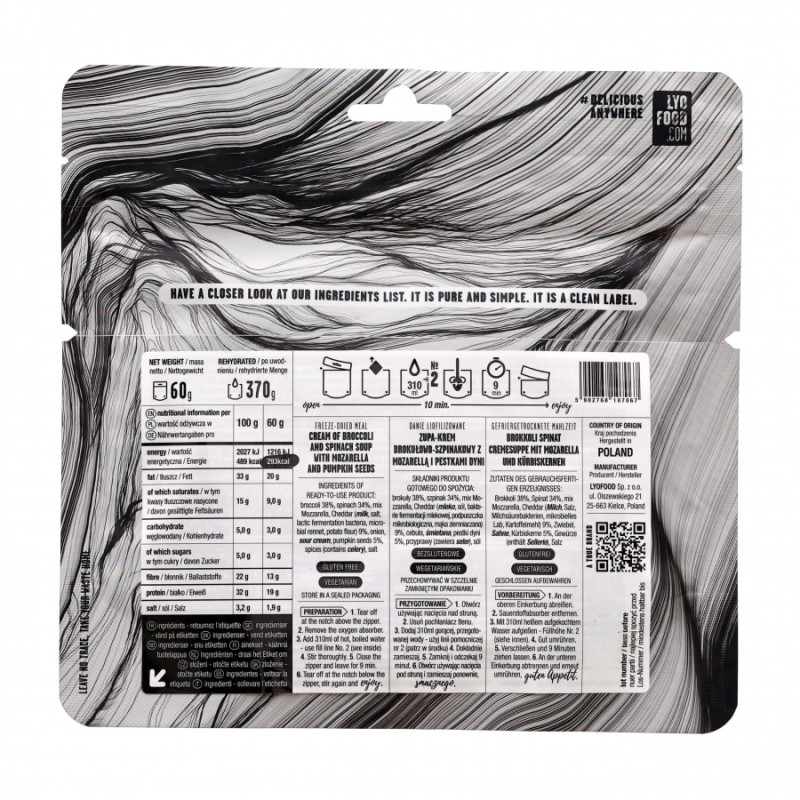 Myśląc o liofilizowanej żywności z reguły mamy przed oczami owoce lub potrawy oparte na ryżu i mięsie. Nowa kolekcja LyoFood pozwoli nam cieszyć się smakiem bogatych i rozgrzewających zup, które z pewnością docenimy w roli lekkiego, aczkolwiek pożywnego lunchu w terenie. Skorzystaj z unikalnych kompozycji kremowych liofilizatów LyoFood i zapewnij sobie prawdziwą przyjemność z jedzenia na łonie natury. Wersja bazująca na kremie brokułowo-szpinakowym wzbogaconym smakiem mozzarelli oraz pestek dyni.