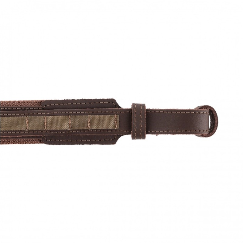 Pas skórzany ACROPOLIS o szerokości 18 mm to funkcjonalne zawieszenie do broni, wykonane z naturalnej skóry i dodatkowo ozdobione eleganckimi przetłoczeniami. Pas nie został wyposażony w żadną formę dodatkowych, metalowych zapięć. Mocowanie na broni odbywa się w prosty i niezawodny sposób: chusta wsuwa się w otwór pasa, a pasek przechodzi przez temblak. Dodatkowe tekstylne zapięcie stabilizuje pasek przed poluzowaniem. Model jest w kolorze brązowym.