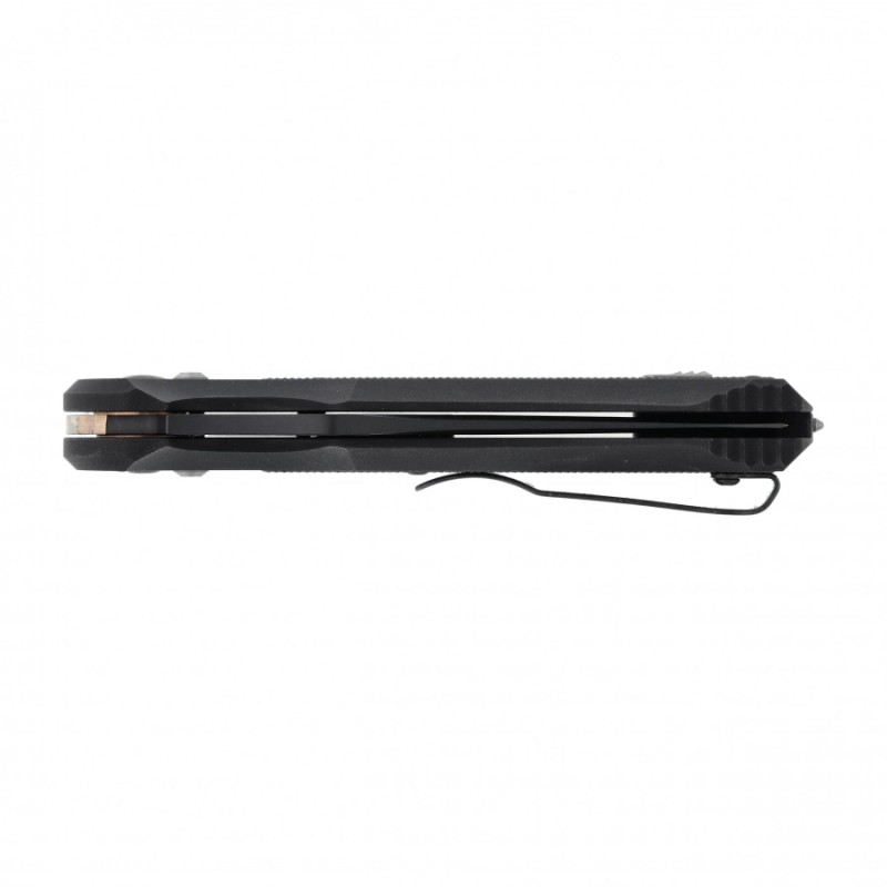 Szeroką klingę drop-point o długości 96 mm, pokryto teflonową powłoką, która podkreśla taktyczny charakter noża. Klinga ma mocny sztych i wysoki szlif wklęsły, co gwarantuje płynne cięcie oraz łatwą penetrację. Głownia w najszerszym miejscu ma aż 3,1 mm grubości. Tylny odcinek grzbietu podniesiono i wykonano na nim poprzeczne frezy, pozwalającą na stabilne oparcie palca podczas pracy. Takie parametry gwarantują funkcjonalność i wytrzymałość noże oraz powodują, że może być wykorzystywany do zadań ratowniczych i taktycznych.