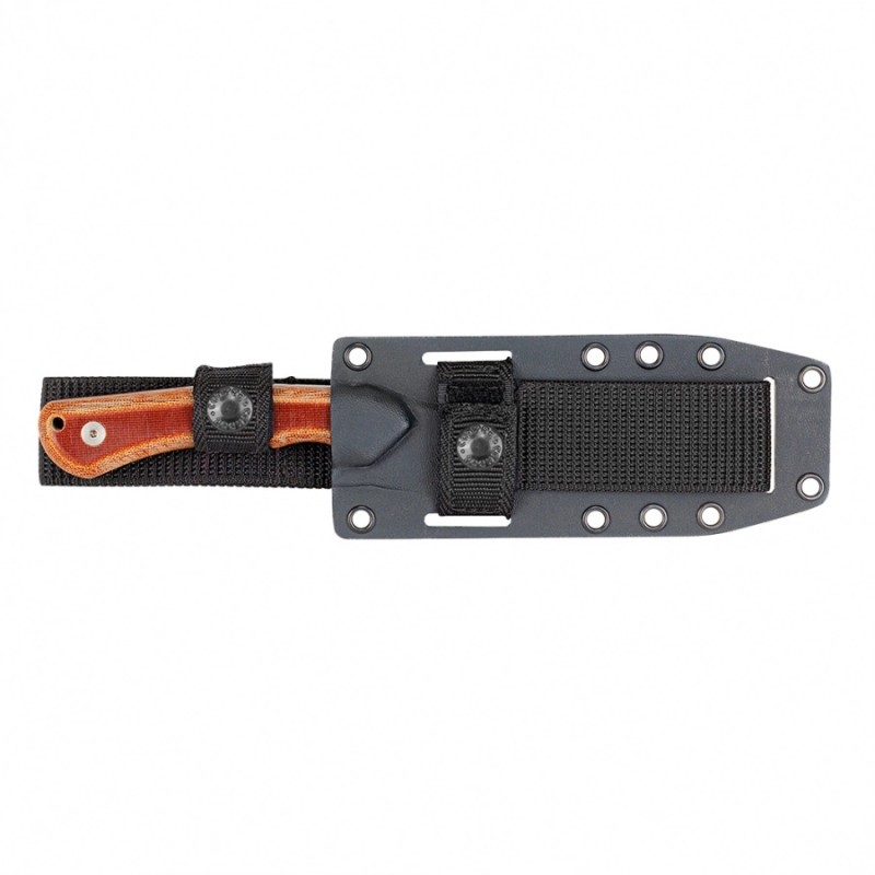 Nóż bushcraftowy Condor X.E.R.O. Stinger ma profilowane okładziny z brązowej micarty mocowane do trzpienia 3 stalowymi śrubami. W tylnej części znajduję się otwór, który pozwala na mocowanie linki lub rzemienia. Do przenoszenia Condor X.E.R.O. Stinger służy kydexowa pochewka o otwartej konstrukcji. Pochewka w standardzie MOLLE ma szeroką nylonową szlufkę, która umożliwia wygodne przenoszenie przy pasie podczas aktywności outdoorowej.