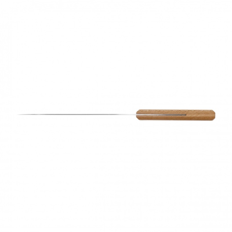 Rękojeść została wykonana z naturalnego drewna bukowego – surowca, który nie tylko pięknie się prezentuje, ale także zapewnia doskonałą przyczepność i wygodę pracy. Jest odpowiednio wyprofilowana, co sprawia, że nóż pewnie leży w dłoni i umożliwia długą pracę bez zmęczenia. Ergonomiczny kształt rękojeści w połączeniu z idealnie wyważonym ostrzem tworzą narzędzie, które współpracuje z Tobą przy każdym ruchu.