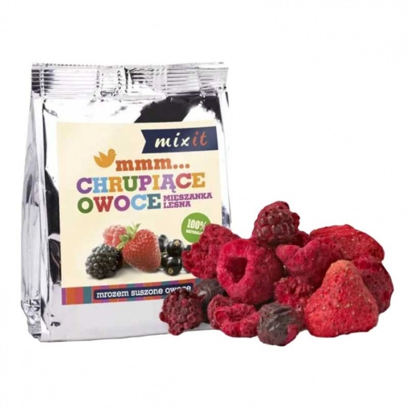 Specjaliści od zdrowej żywności tym połączyli truskawki z jeżynami, czarnymi porzeczkami i malinami. Owoce suszone mrozem okazały się strzałem w dziesiątkę. Owocowa przekąska Mixit jest idealnie krucha i co ciekawe, nie trzeba jej nawet przechowywać w lodówce (przed otwarciem). Liofilizowane owoce Mixit pakowane do szczelnej saszetki strunowej, dlatego można je wygodnie chrupać pracy, w szkole oraz podczas wycieczki.