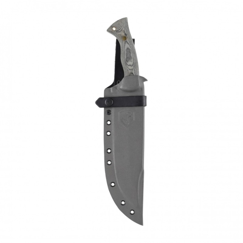 Do noża dołączono obustronną kydexową pochwę. Wyposażono ją w skórzaną szlufkę, pozwalającą przenosić narzędzie przy pasie.