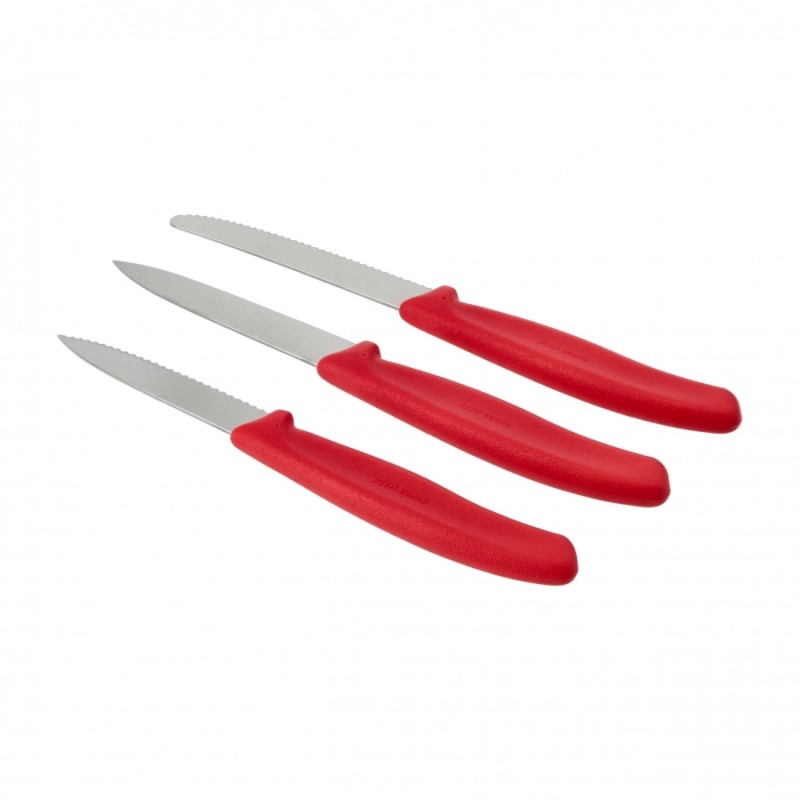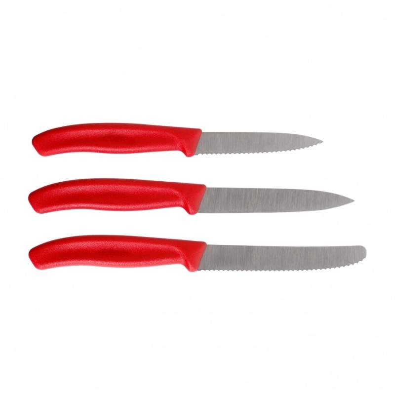 Zestaw trzech noży Victorinox 6.7113.34C1 to sprawdzone narzędzia, które pomogą nam w kuchni w wielu różnych zadaniach. Wersja noży wyposażonych w rękojeści w kolorze czerwonym.