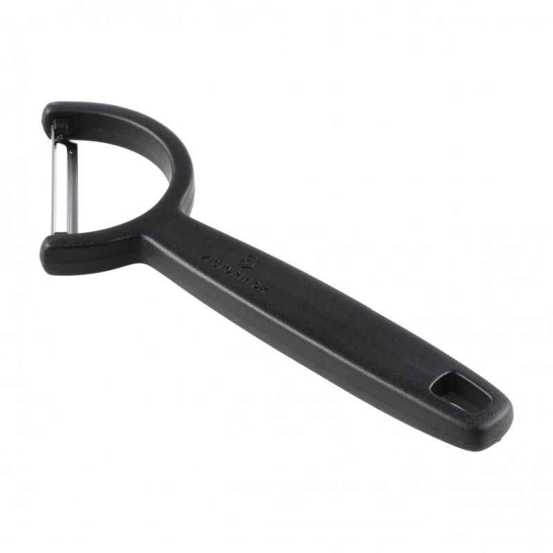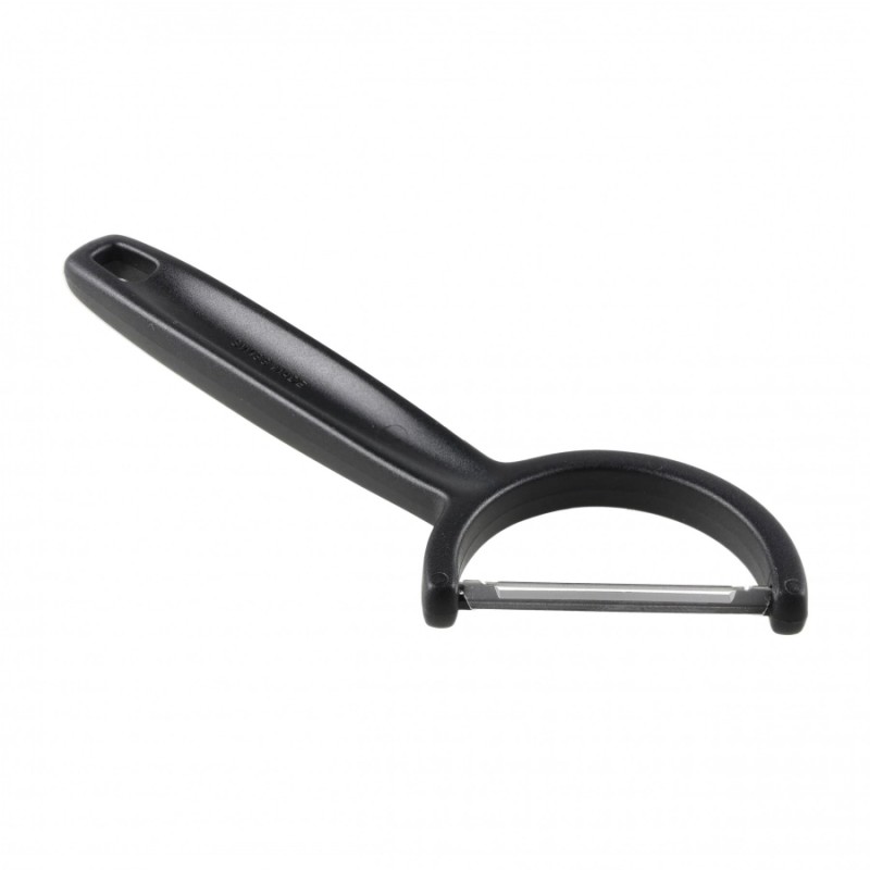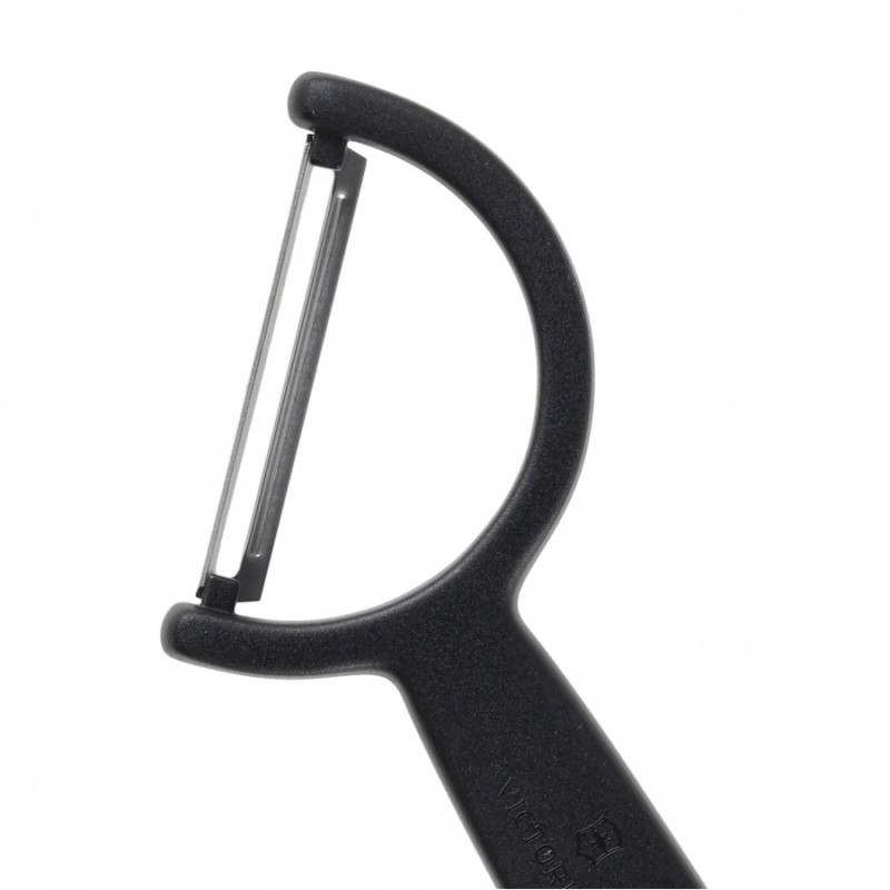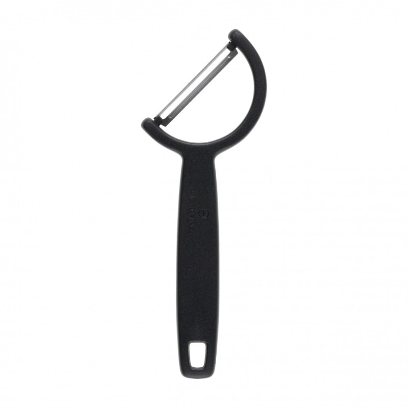 Uniwersalna obieraczka Victorinox RHO to praktyczne narzędzie kuchenne służące do wygodnego i szybkiego obierania warzyw oraz owoców z miękkich i twardych skórek. Zaprojektowana została z ostrzem w ułożeniu ukośnym. Antypoślizgowa rękojeść o ergonomicznym profilu wykonana jest z solidnego tworzywa i ma dodatkowo otwór do zawieszenia. Ruchome ostrze wykonano ze stali nierdzewnej. Obieraczkę można myć pod bieżącą wodą oraz w zmywarce. Model jest w kolorze czarnym.