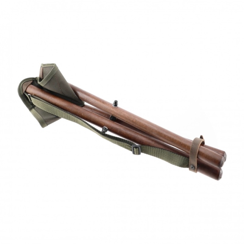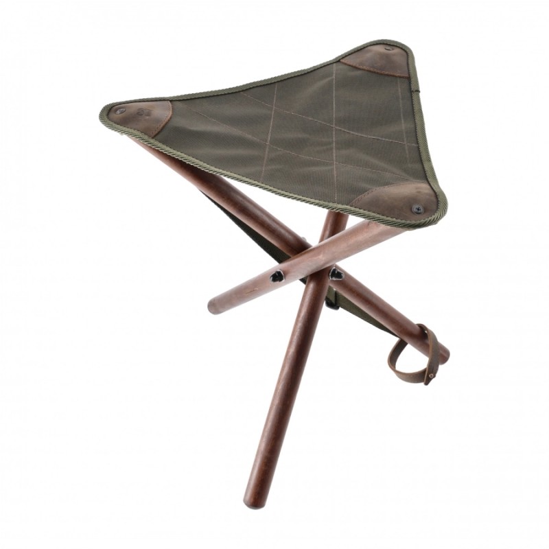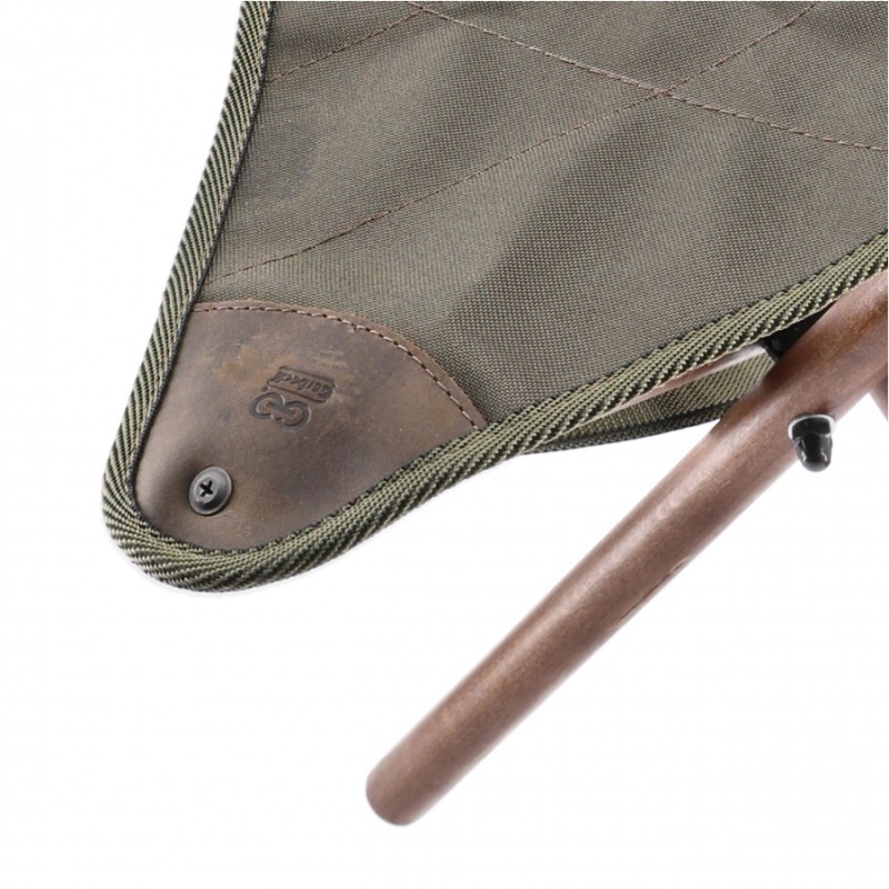 Rama stołka wykonana została z lakierowanego, odpornego na uszkodzenia drewna, które nadaje całości rustykalny charakter i zapewnia stabilność w różnych warunkach terenowych. Siedzisko z wytrzymałego płótna w kolorze oliwkowym zostało dodatkowo wzmocnione skórzanymi naszywkami w narożnikach – to nie tylko wzmocnienie, ale i element estetyczny nawiązujący do klasycznego sprzętu myśliwskiego. Trójnożna konstrukcja gwarantuje równowagę nawet na nierównym gruncie.