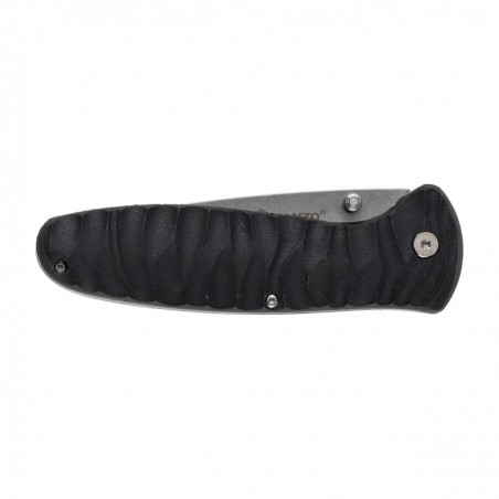 Za wygodne operowanie nożem w głównej mierze odpowiada rękojeść. Ganzo G6252-BK ma profilowane okładziny z tworzywa G-10 mocowane do stalowych wkładek szkieletu śrubami torx. Karbowana tekstura tworzywa oraz ergonomiczny profil rękojeści, sprawiają, że nóż pewnie i wygodnie leży również w mokrej lub zmarzniętej dłoni. Wygodne przenoszenie noża w kieszeni, na pasku lub przy plecaku zapewnia sprężysty stalowy klips (tip up) mocowany po prawej stronie.