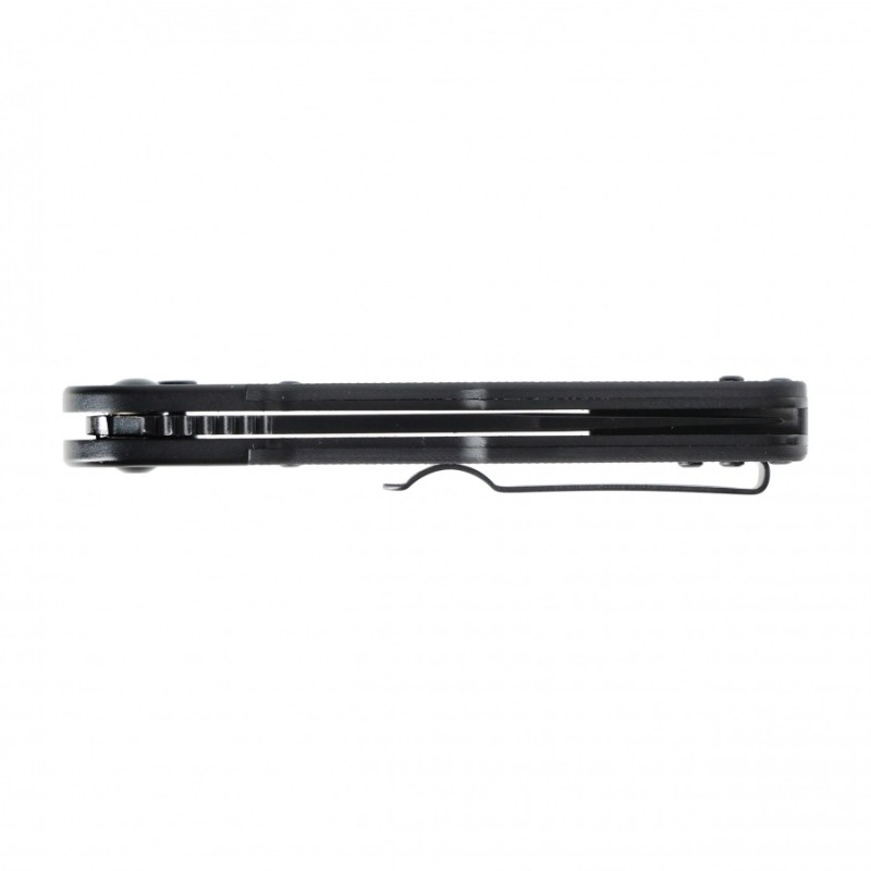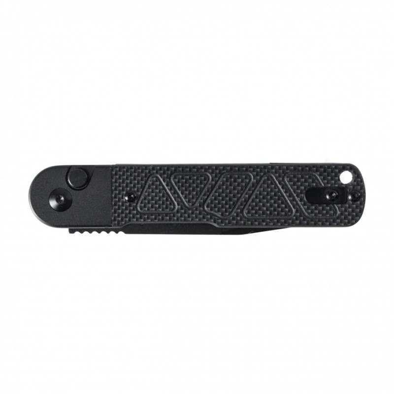 Okładziny rękojeści noża Ganzo G767PT-BK wykonano z barwionego na czarno tworzywa G10. Ten kompozyt z włókna szklanego i syntetycznej żywicy jest lekki i niepodatny na uszkodzenia mechaniczne. Chropowata faktura okładzin sprawia, że nóż dobrze leży nawet w spoconej dłoni. W tylnej części rękojeści znajduje się otwór na linkę lub smycz zabezpieczającą. Producent zadbał także o wygodny transport noża, wyposażając go w klips.