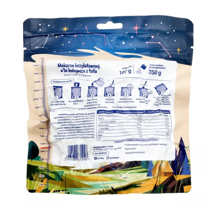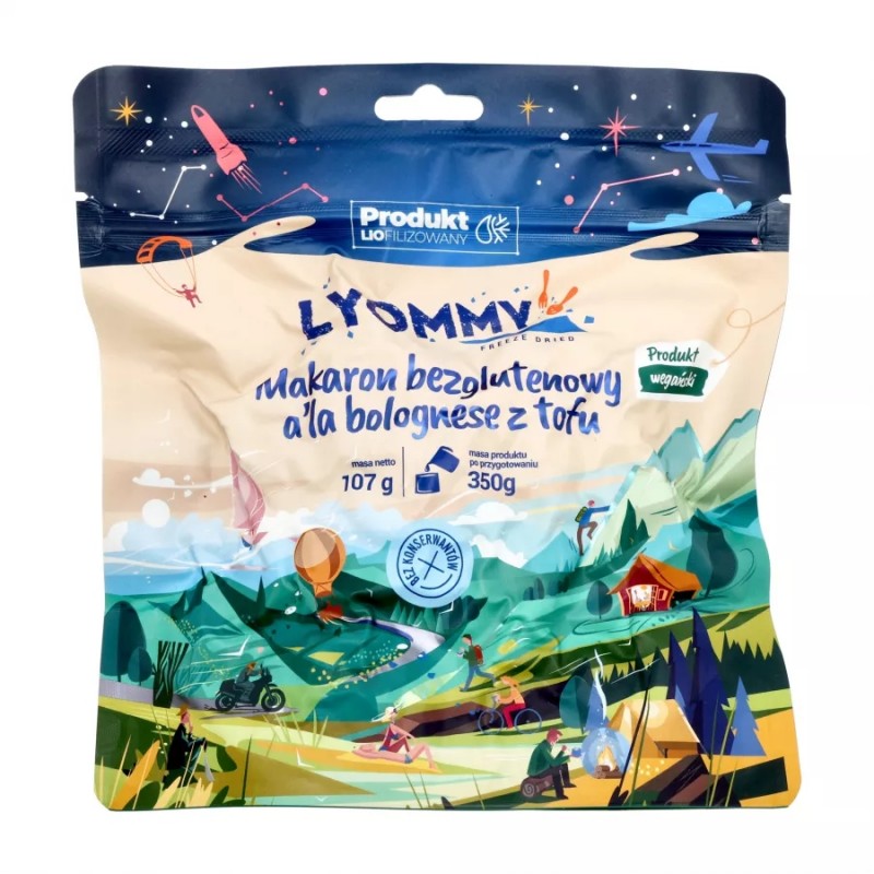 Danie liofilizowane Lyommy składa się z makaronu bezglutenowego, który w otoczeniu sosu a'la bolognese i dodatku tofu tworzy niepowtarzalną kompozycję smakową w turystycznej formie.