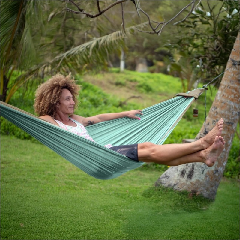 Wykonany z nylonu spadochronowego 70D, hamak jest nie tylko oddychający i elastyczny, ale także odporny na pleśń oraz szybkoschnący – sprawdza się więc w każdych warunkach pogodowych. Potrójne szwy zwiększają jego trwałość, a maksymalne obciążenie 200 kg gwarantuje bezpieczeństwo i stabilność. Oddychający materiał dopasowuje się do ciała, wspierając krążenie krwi i zapobiegając przegrzaniu, co czyni odpoczynek wyjątkowo komfortowym. W bocznej kieszeni bez trudu schowasz drobiazgi, a wbudowany Express Setting Bag pełni rolę nie tylko pokrowca, ale również wygodnej poduszki.