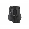 Kabura mocowana jest na pasie (maksymalna szerokość 55 mm) za pomocą szerokiej płetwy, dzięki czemu przylega blisko ciała strzelca i jest dyskretna w przenoszeniu. Płetwa ma płynną regulacją kąta nachylenia w zakresie 360°, dlatego kaburę można dostosować do własnych preferencji, co zwiększa komfort oraz szybkość dobycia. Regulacji dokonujemy za pomocą klucza imbusowego.
