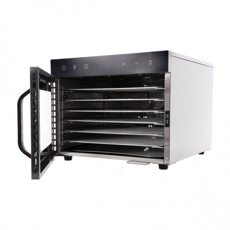 Regulowany zakres temperatur od 25 do 90°C umożliwia dopasowanie procesu suszenia do różnych produktów – od delikatnych ziół po mięsa i ryby. Wentylator o średnicy 15 cm generuje poziomy strumień suchego powietrza, dzięki czemu suszenie odbywa się równomiernie na wszystkich sześciu tacach. To oznacza, że nawet do 4 kg produktów zostanie wysuszonych precyzyjnie, z zachowaniem smaku, aromatu i cennych wartości odżywczych.
