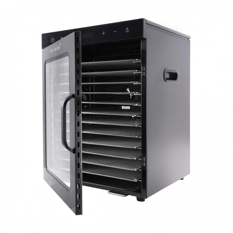 Dzięki dotykowemu panelowi sterowania masz pełną kontrolę nad procesem suszenia. Regulacja temperatury w zakresie 25–90°C oraz timer ustawiany od 30 minut do 72 godzin pozwalają perfekcyjnie dostosować parametry do każdego rodzaju żywności. Oświetlenie LED wbudowane w przezroczyste drzwiczki umożliwia kontrolę procesu bez otwierania urządzenia, co pozwala zachować stabilne warunki pracy i maksymalną efektywność.