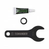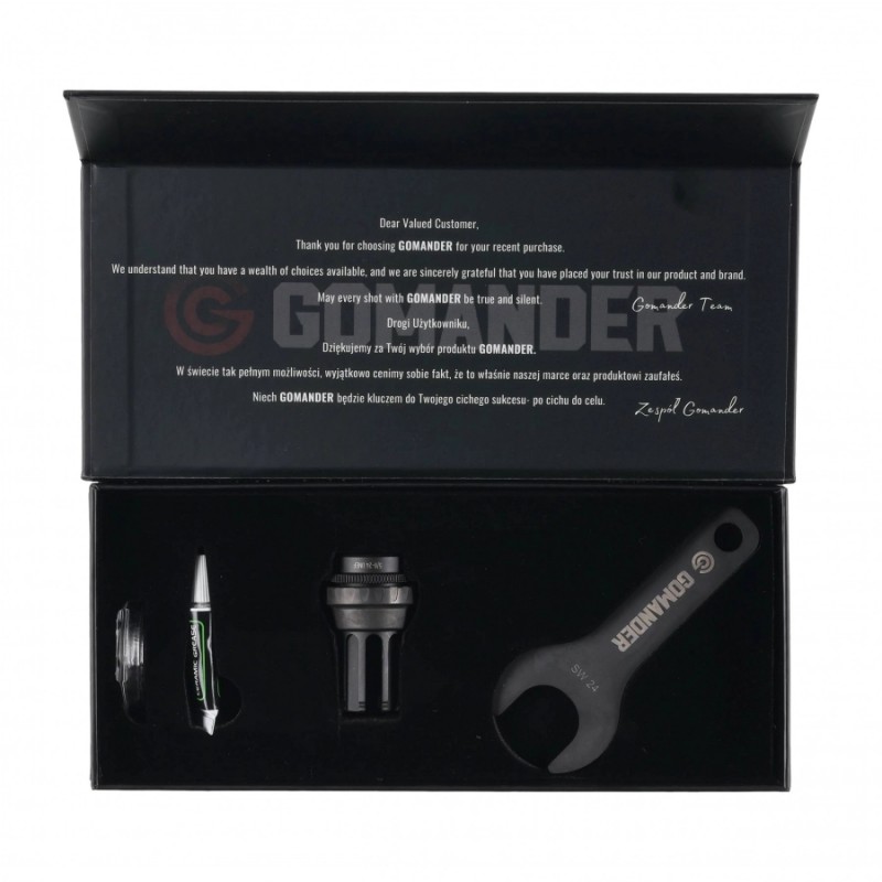 Zawrtość zestawu: kompensator płomienia Gomander Quadron Evo 7,62 mm 5/8"-24 UNEF, podkładka sprężynująca, nakrętka zabezpieczająca gwint, smar ceramiczny, kluczyk montażowy.