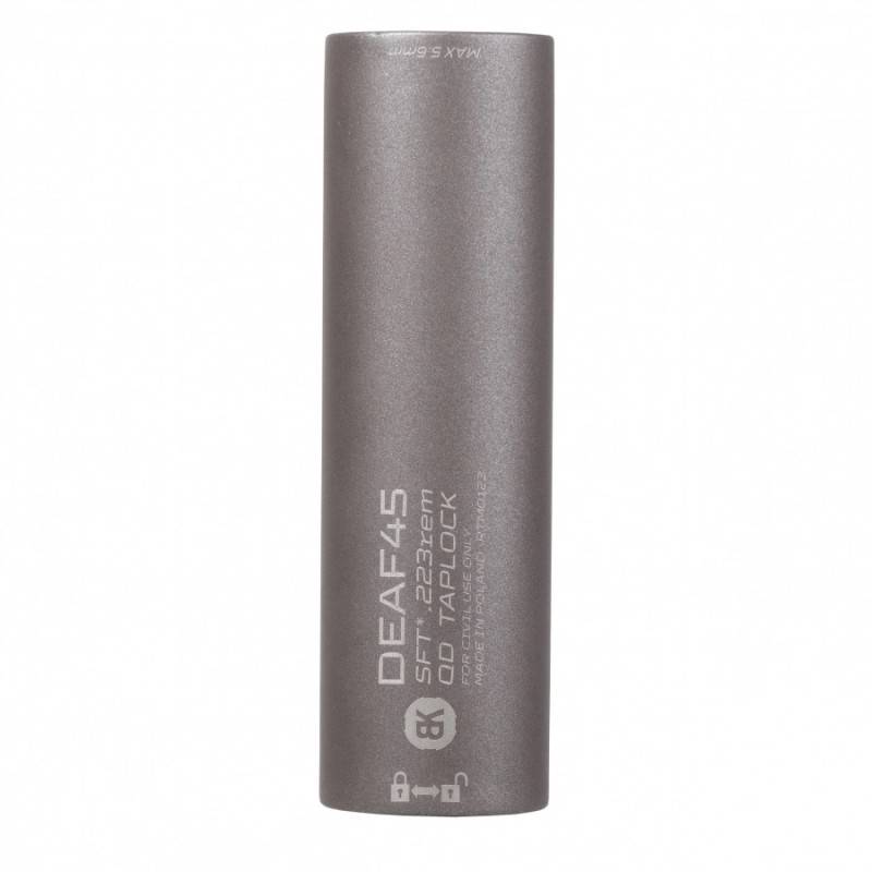 Tłumik dźwięku BK Precise DEAF45 został skonstruowany z myślą o wykorzystaniu pod intensywnym ogniem na broni samopowtarzalnej. Wykorzystana technologia Side Flow nie tylko ogranicza odrzut, ale również przegazowanie broni, dzięki czemu podczas dynamicznych strzelań nie będziemy skazani na oddychanie gazami wentylującymi się przy naszej twarzy. Powierzchnia urządzenia została pokryta najpopularniejszym systemem powłok ceramicznych - Cerakote - który gwarantuje zabezpieczenie przed kwaśnym środowiskiem tworzonym przez pozostałości prochu. Bazowy hamulec wylotowy otrzymał natomiast elektrochemiczną powłokę Tenifer, zabezpieczającą go zarówno przed korozją, jak i wycieraniem pod wpływem kontaktu z tłumikiem.