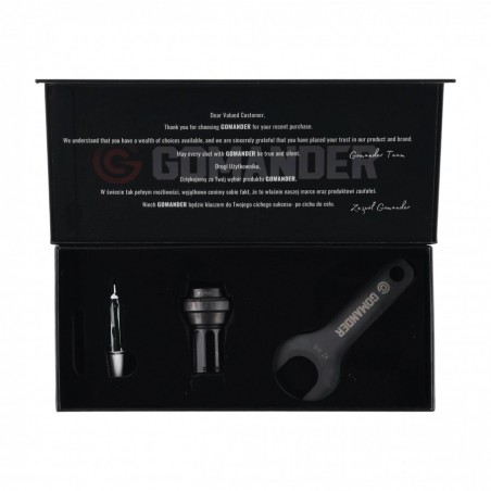 Zawrtość zestawu: kompensator płomienia Gomander Quadron Evo 7,62 mm M14x1 LH, podkładka sprężynująca, nakrętka zabezpieczająca gwint, smar ceramiczny, kluczyk montażowy.