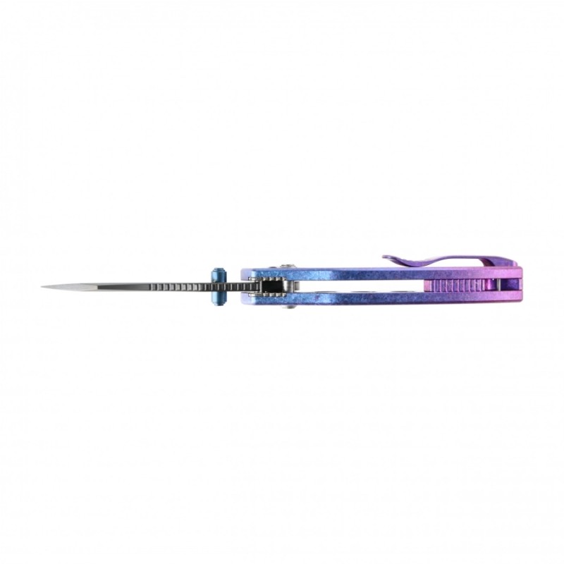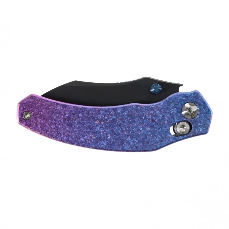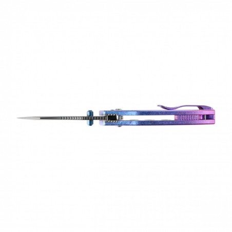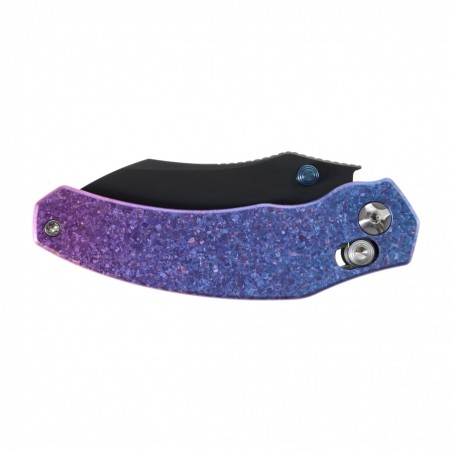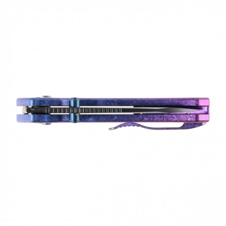 Rękojeść Mini Bulldog to połączenie klasycznego tytanu i krystalizowanego tytanu w odcieniach fioletu i niebieskiego, co sprawia, że każdy egzemplarz prezentuje się unikalnie i bardzo stylowo. Ergonomiczny kształt zapewnia pewny chwyt, a długość rękojeści 93 mm gwarantuje komfort nawet podczas dłuższej pracy. Całość uzupełnia trwały, tytanowy klips (nieodwracalny), dzięki któremu nóż łatwo i bezpiecznie przeniesiesz w kieszeni.