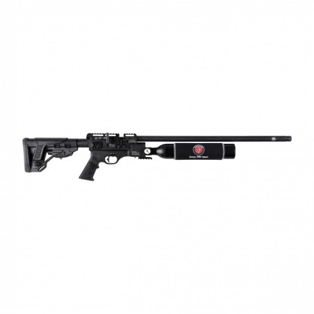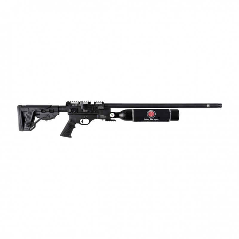 Optima by Hatsan Factor 4,5 mm to karabinek PCP w militarnym stylu, wyposażony w precyzyjną czokowaną lufę, taktyczną kolbę z regulowaną stopką oraz 2-stopniowy mechanizm spustowy z regulacją języka spustowego.