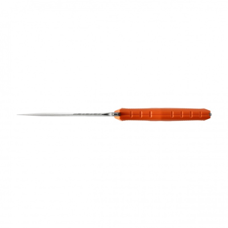 Energetyczny pomarańczowy kolor rękojeści G10 nie tylko ułatwia odnalezienie noża w ekwipunku, ale też przyciąga uwagę i podkreśla unikalny charakter modelu.