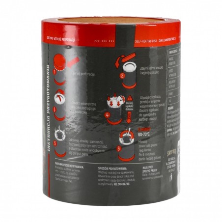 Puszka ma bezpieczny, zintegrowany system podgrzewania oraz praktyczne dodatki pod wieczkiem: sól, pieprz i wilgotną serwetkę – jesz komfortowo w każdych warunkach. Produkt jest sterylizowany i bez konserwantów, dlatego świetnie sprawdzi się w ekwipunku survivalowym, w aucie awaryjnym, na wyprawie i w domowej rezerwie żywności.