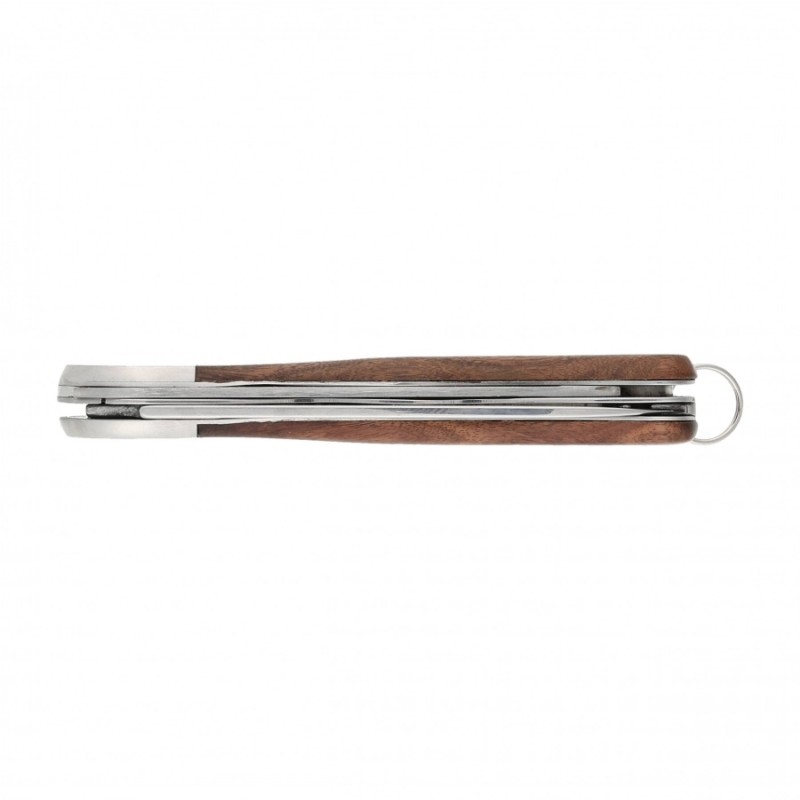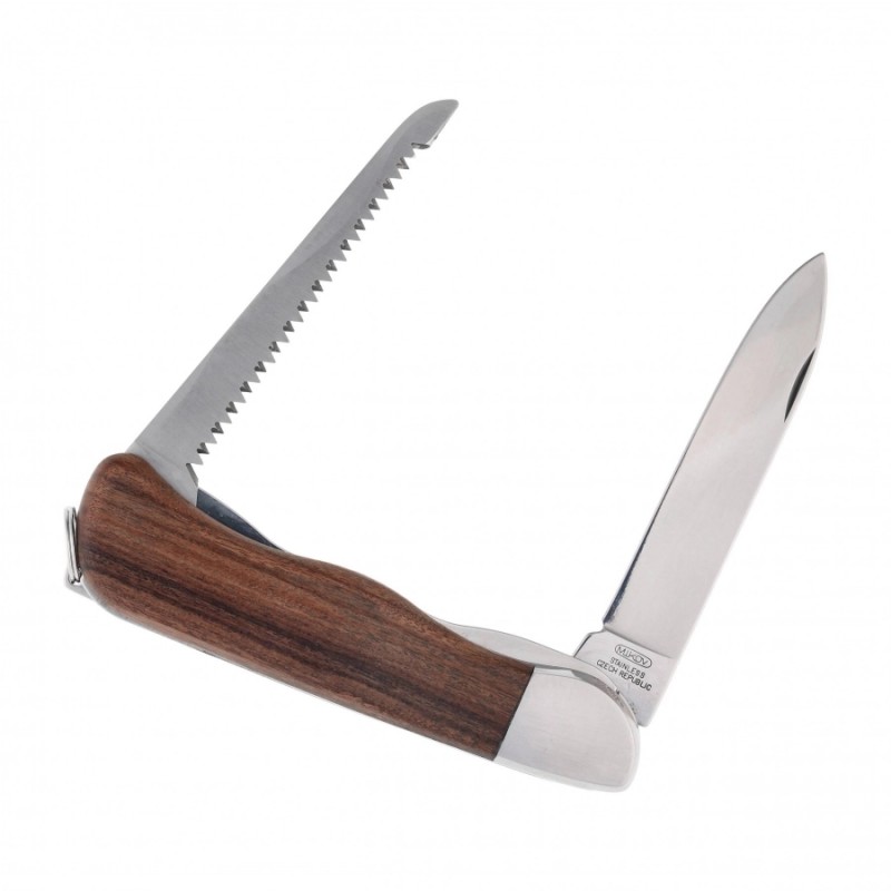 Ostrze scyzoryka HIKER jest wykonane z wysokiej jakości stali nierdzewnej 420 o twardości na poziomie 53-55 HRC. Dodatkowo to kieszonkowe narzędzie jest wyposażone w piłę z dwoma rzędami zębów, a rękojeść wykonana została z wysokiej jakości egzotycznego drewna palisandru (Rosewood). Na końcu rękojeści znajdziesz kółko do mocowania linki lub smyczy.