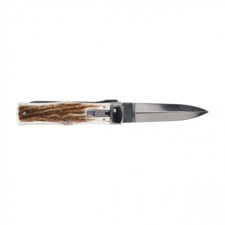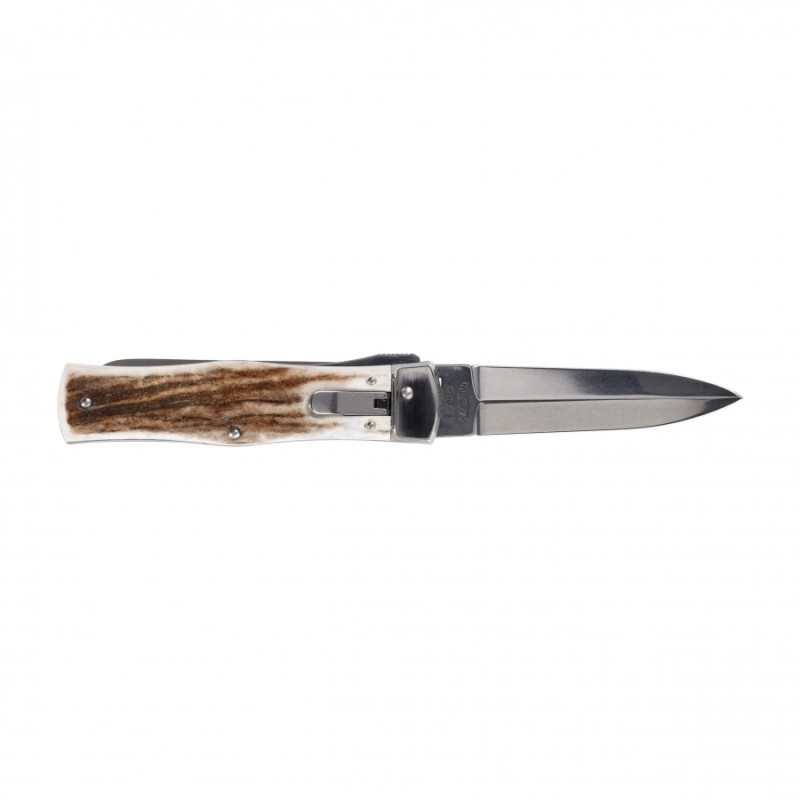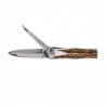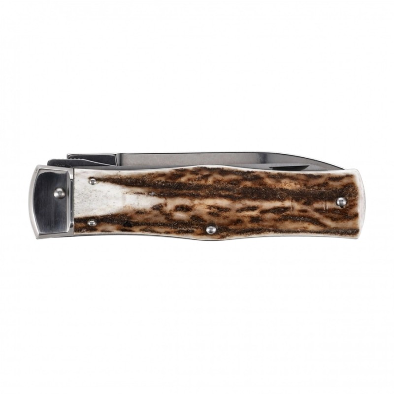 Rękojeść noża została wykonana z naturalnego poroża jelenia, cenionego przez myśliwych i miłośników przyrody za niepowtarzalny wygląd i wyjątkową trwałość. Jej ergonomiczny kształt zapewnia pewny, komfortowy chwyt nawet w wilgotnych warunkach, minimalizując ryzyko poślizgu i chroniąc dłoń przed urazami. To połączenie elegancji natury z funkcjonalnością, które sprawia, że każdy uchwyt daje poczucie kontroli i bezpieczeństwa. Z uwagi na brak klipsa, do codziennego noszenia noża zastosowano skórzane etui na pas, zamykane na napę.