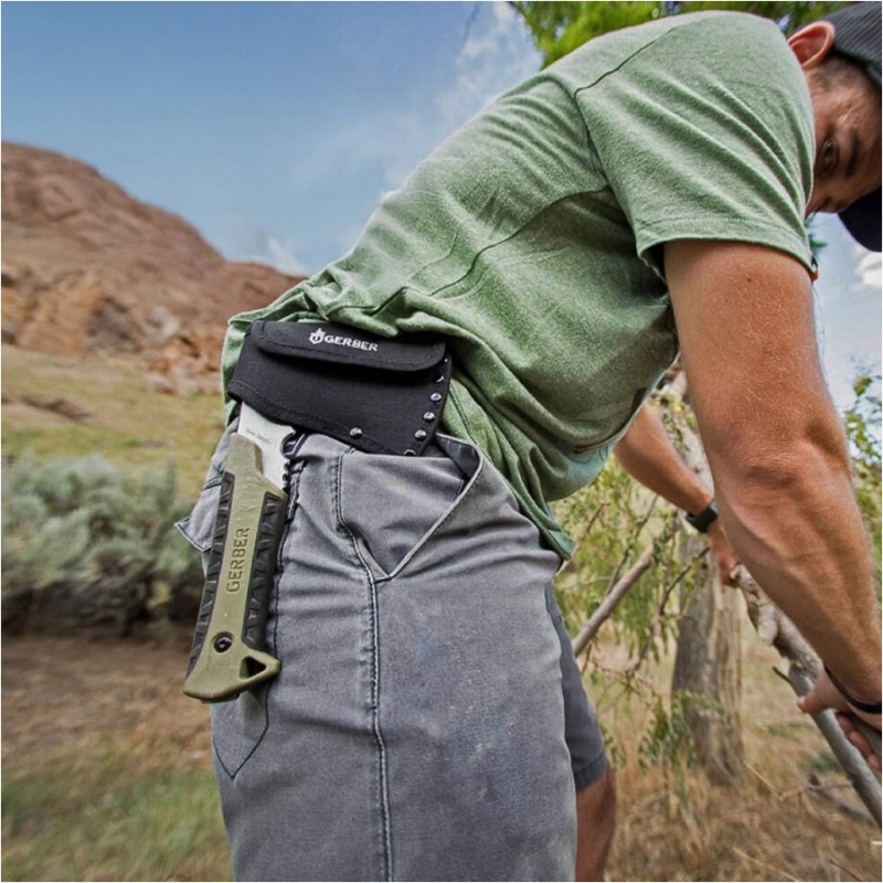 Wytrzymały pokrowiec z niepleśniejącego nylonu chroni ostrze podczas przenoszenia i przechowywania. Pętla do zawieszenia i szlufki na pasek ułatwiają montaż na biodrze lub w obozie, dzięki czemu toporek masz zawsze w zasięgu dłoni. Kompaktowy format = mniej zbędnego bagażu, więcej sprawczości w terenie.