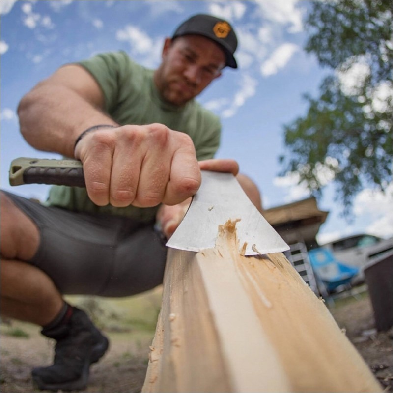 Niemal 9-centymetrowe ostrze typu Full Tang daje świetną kontrolę, a nacięcia pod palce między ostrzem a chwytem pozwalają wygodnie strugać, podcinać korę i przygotowywać kindling. Wyważenie z większością masy w głowni sprawia, że toporek tnie i rąbie drewno znacznie lepiej, niż sugeruje jego rozmiar. Tylna część głowni działa jak skuteczny młotek – idealny do wbijania śledzi.