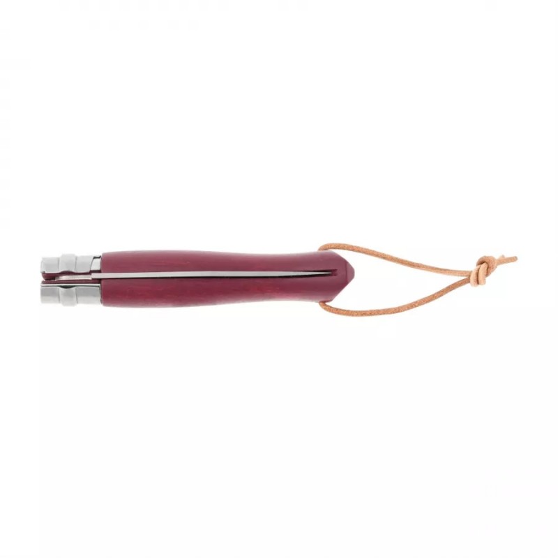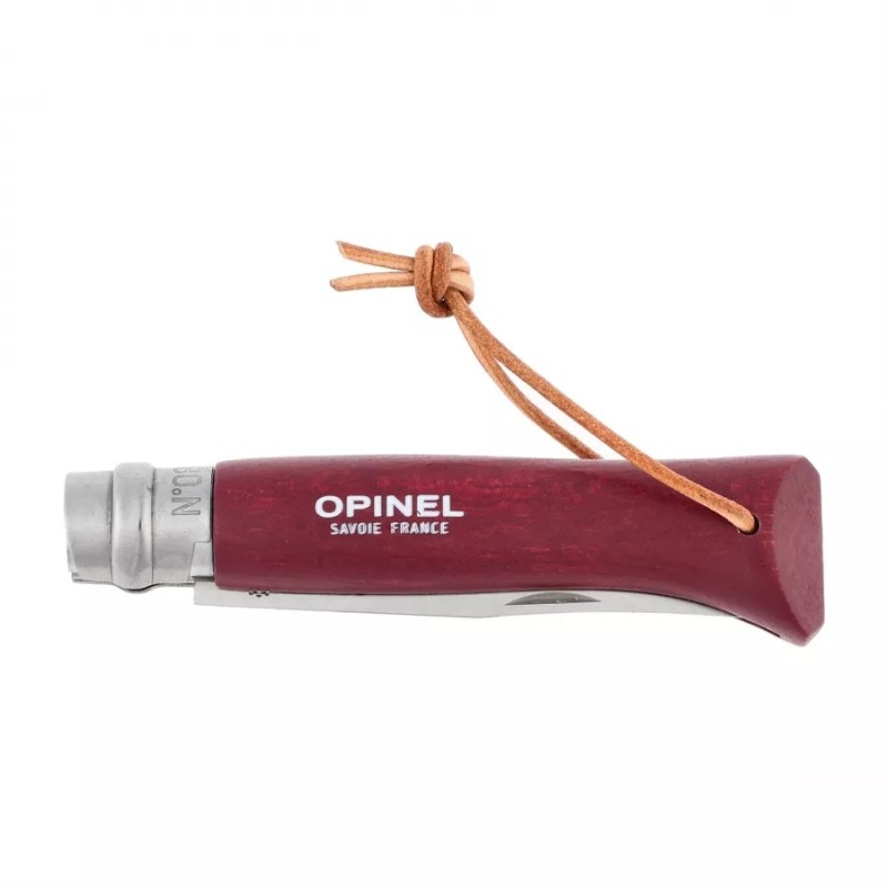 Opinel Colorama 08 inox bordowy z rzemieniem to składany nóż outdoorowy, wyposażony w ostrze ze stali nierdzewnej Sandvik 12C27M, blokadę Virobloc, oraz drewnianą rękojeść z rzemieniem do mocowania.