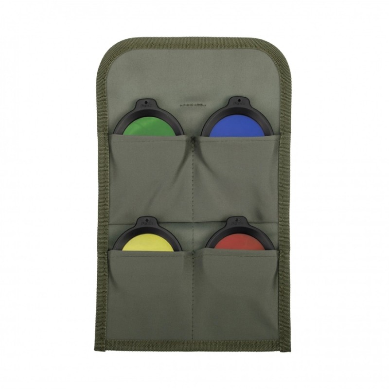 Filtry zamknięto w adapterze o średnicy 68 mm i wadze zaledwie 13,8 g – nie obciążają wyposażenia, a montaż jest szybki i intuicyjny. Całość mieści się w wytrzymałym etui o kompaktowych wymiarach, które bez problemu schowasz w plecaku czy torbie. Niezależnie od tego, czy jesteś w lesie, na polowaniu, czy w trakcie nocnych działań terenowych, zawsze masz pod ręką narzędzie, które pozwoli Ci dopasować oświetlenie do sytuacji.
