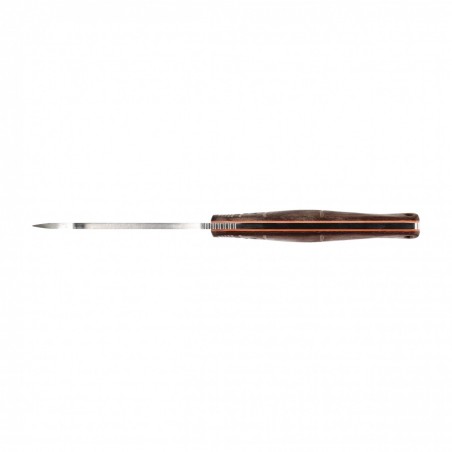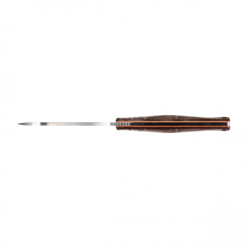 Krótkie ostrze o wklęsłym szlifie ma wydatnie zaokrąglony brzuch oraz mocny sztych co w połączeniu z profilem drop point zapewnia dobre walory użytkowe. Na tylnej części grzbietu wykonano poprzeczne frezy, które tworzą stabilny punkt oparcia dla palców. To popularne udogodnienie pozwala na wygodne i precyzyjne operowanie nożem, co dla myśliwego jest kluczowe podczas sprawiania zwierzyny.