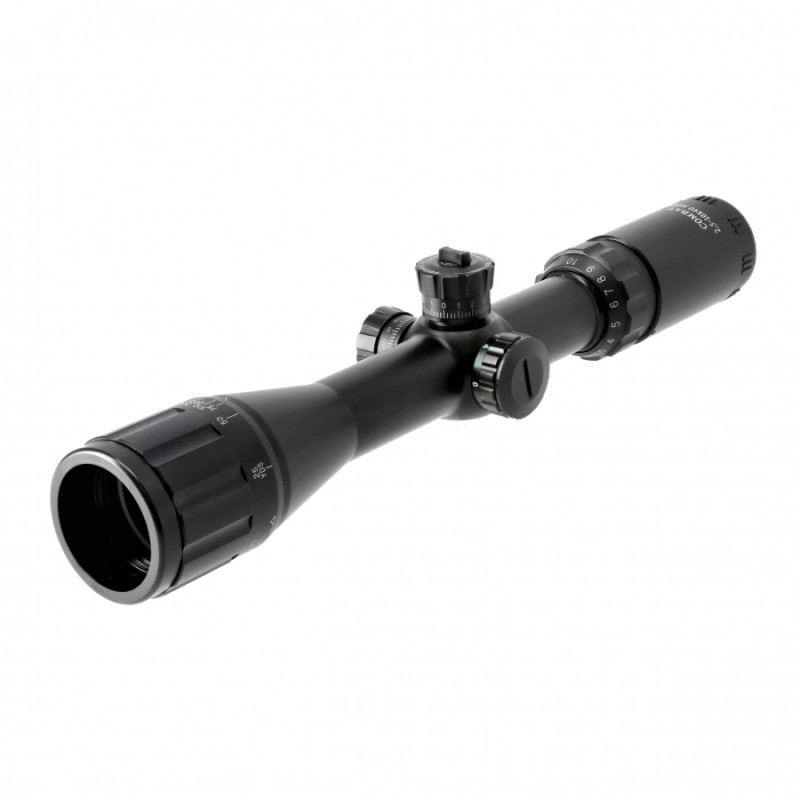 Przystępna cenowo luneta celownicza marki Combat oferująca powiększenie w zakresie 2,5-10x przy średnicy obiektywu 40 mm. Aluminiowy korpus został pokryty zabezpieczającą powłoką, która ogranicza zarysowania mogące strukturalnie uszkodzić materiał. Podświetlany krzyż celowniczy sprawia, że luneta może pracować zarówno w warunkach bardzo intensywnego jak i niskiego oświetlenia.