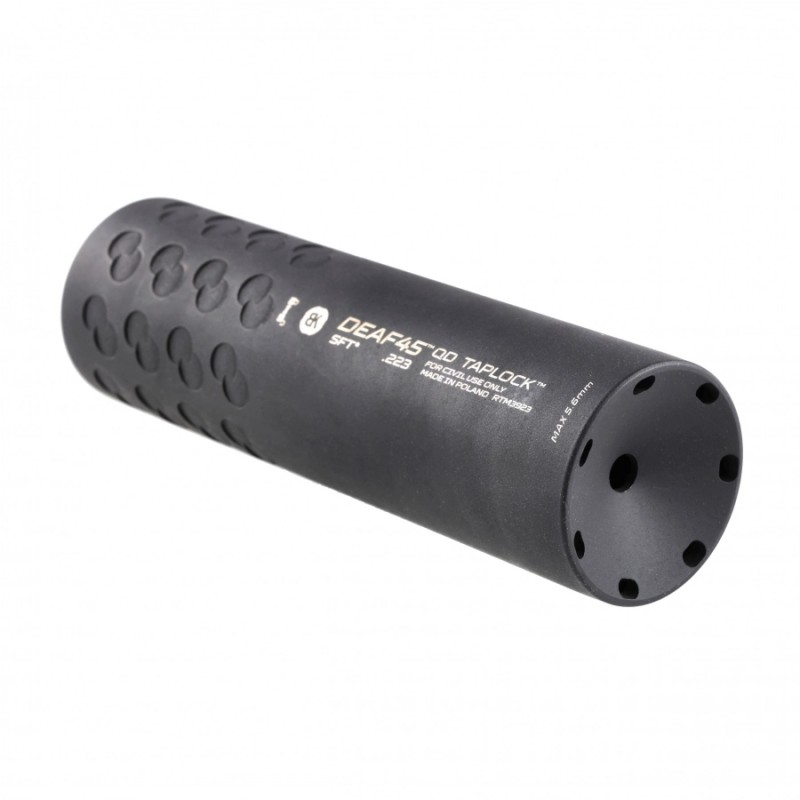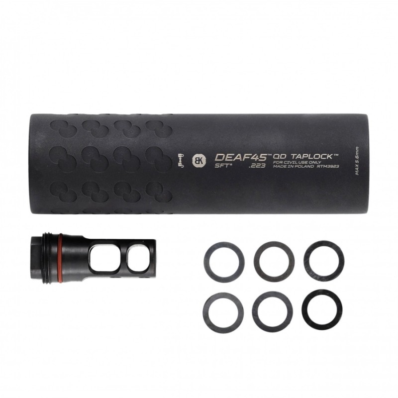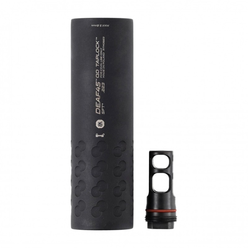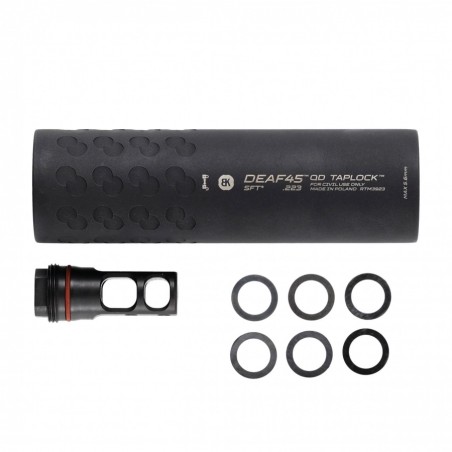 Zestaw tłumika dźwięku współpracującego za pomocą systemu QD z dołączonym urządzeniem wylotowym to idealne rozwiązanie dla każdej osoby, zajmującej się strzelectwem dynamicznym. Połączenie skutecznej redukcji hałasu z systemami zapewniającymi możliwie komfortową pracę na wytłumionej broni sprawiają, że moderator BK Precise DEAF45 QD Taplock doskonale sprawdzi się wszędzie tam gdzie spodziewamy się dużej intensywności ognia. Wersja z hamulcem wylotowym dostosowana do użycia na broni z gwintem ½-28 UNEF.