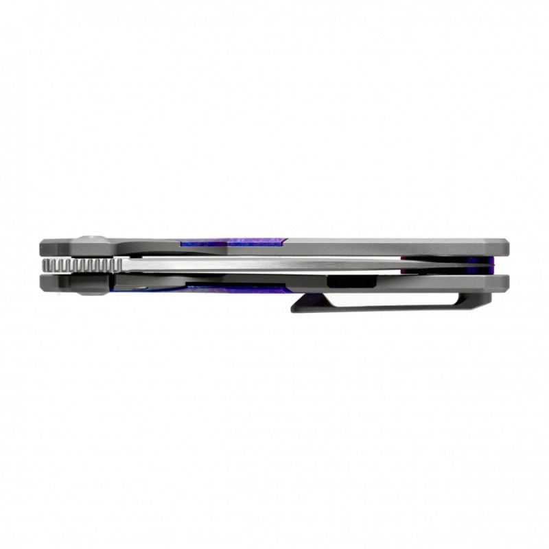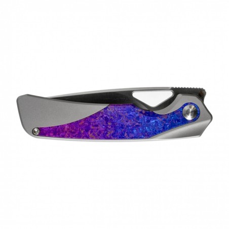 Rękojeść noża Kizer Topsail została wykonana z tytanu, wzbogaconego o wyjątkowe wstawki z tytanu krystalizowanego, które nadają mu unikalny, niemal biżuteryjny charakter. Każdy egzemplarz ma subtelnie inny wzór, dzięki czemu każdy nóż jest jedyny w swoim rodzaju. Tytan nie tylko zachwyca wizualnie, ale też oferuje niezwykłą odporność na zużycie i korozję przy minimalnej wadze. Ergonomiczne linie zapewniają pewny chwyt, a perfekcyjnie dopasowane kontury sprawiają, że Topsail leży w dłoni jak rzeźbiony pod użytkownika.