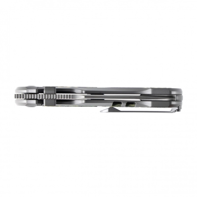 Tytanowa rękojeść z frezowaniami dobrze trzyma się dłoni, a blokada frame lock trzyma ostrze sztywno i składa się płynnie, kiedy kończysz zadanie. Klips tip‑up (prawa strona) dba o niskoprofilowe, wygodne noszenie w kieszeni. Całość działa gładko i sprężyście, więc każdy „klik” przy otwarciu jest równie satysfakcjonujący, co pierwszego dnia.