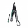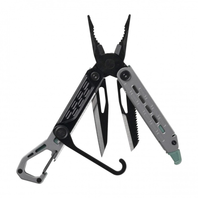 Multitool wykonano z wysokiej jakości stali nierdzewnej, odpornej na korozję i uszkodzenia mechaniczne. Teksturowana rękojeść zapewnia pewny chwyt nawet w wilgotnych lub zabrudzonych dłoniach. Na jej powierzchni znajduje się linijka z podziałką w centymetrach i calach, idealna do pomiarów w terenie. Narzędzie wyposażono również w gładkie ostrze z blokadą Liner Lock, piłę, nożyczki, przecinak i precyzyjne kombinerki – wszystko to w kompaktowej formie o masie zaledwie 154 g.