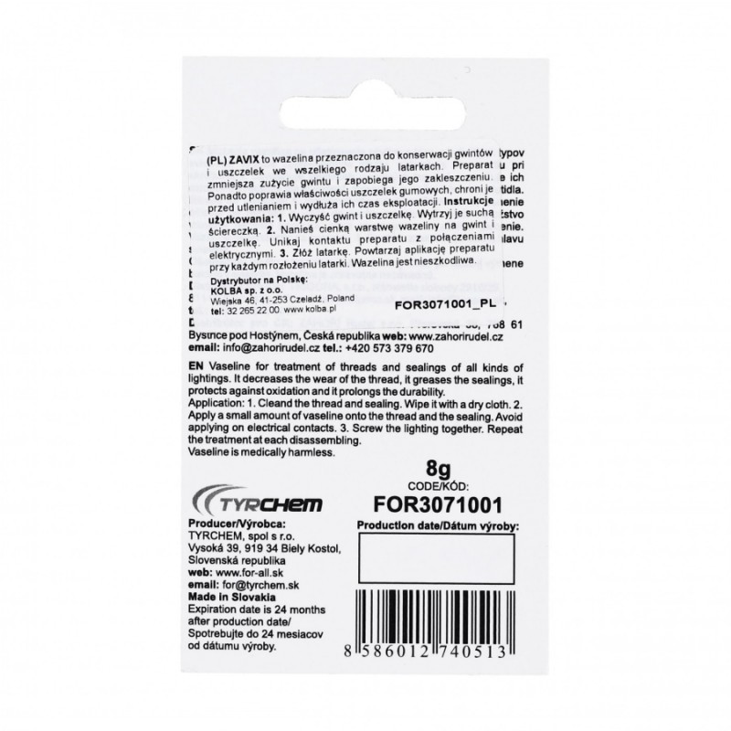 Dzięki swoim właściwościom konserwującym wazelina FOR Zavix to idealny wybór dla osób, które chcą utrzymać swoje latarki taktyczne, akcesoria optyczne czy urządzenia outdoorowe w perfekcyjnej kondycji. Niewielka tubka o pojemności 8 g zmieści się w każdej torbie lub kieszeni, dzięki czemu zawsze możesz mieć ją pod ręką — w terenie lub w warsztacie.
