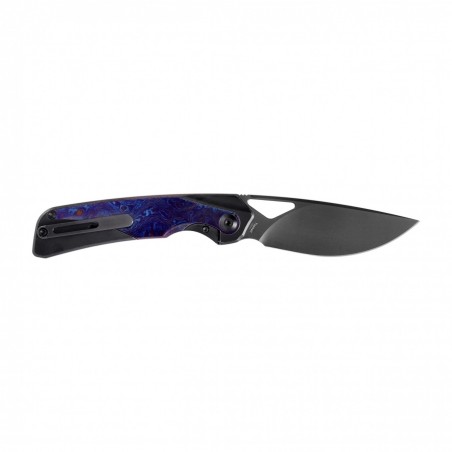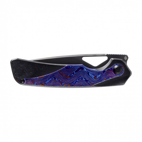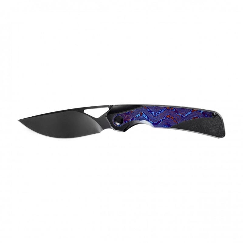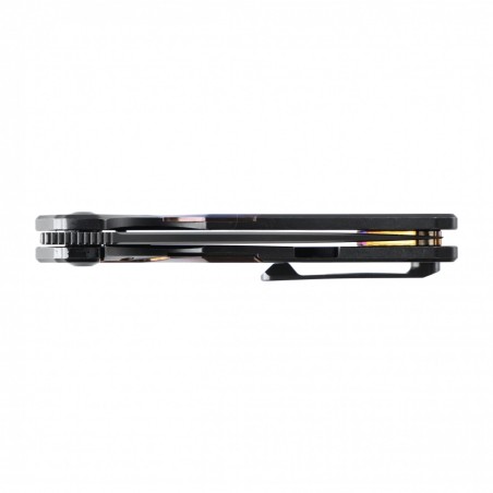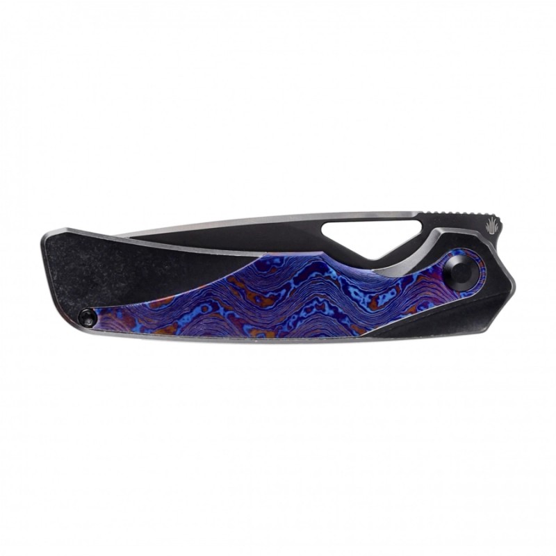 Rękojeść noża Kizer Topsail została wykonana z czarnego tytanu, wzbogaconego o wyjątkowe wstawki z tytanu damasceńskiego, które nadają mu unikalny, niemal biżuteryjny charakter. Każdy egzemplarz ma subtelnie inny wzór, dzięki czemu każdy nóż jest jedyny w swoim rodzaju. Tytan nie tylko zachwyca wizualnie, ale też oferuje niezwykłą odporność na zużycie i korozję przy minimalnej wadze. Ergonomiczne linie zapewniają pewny chwyt, a perfekcyjnie dopasowane kontury sprawiają, że Topsail leży w dłoni jak rzeźbiony pod użytkownika.