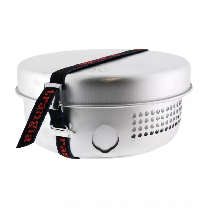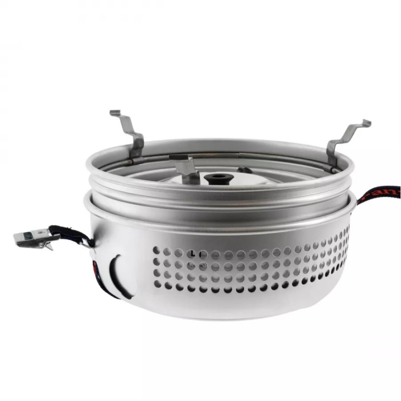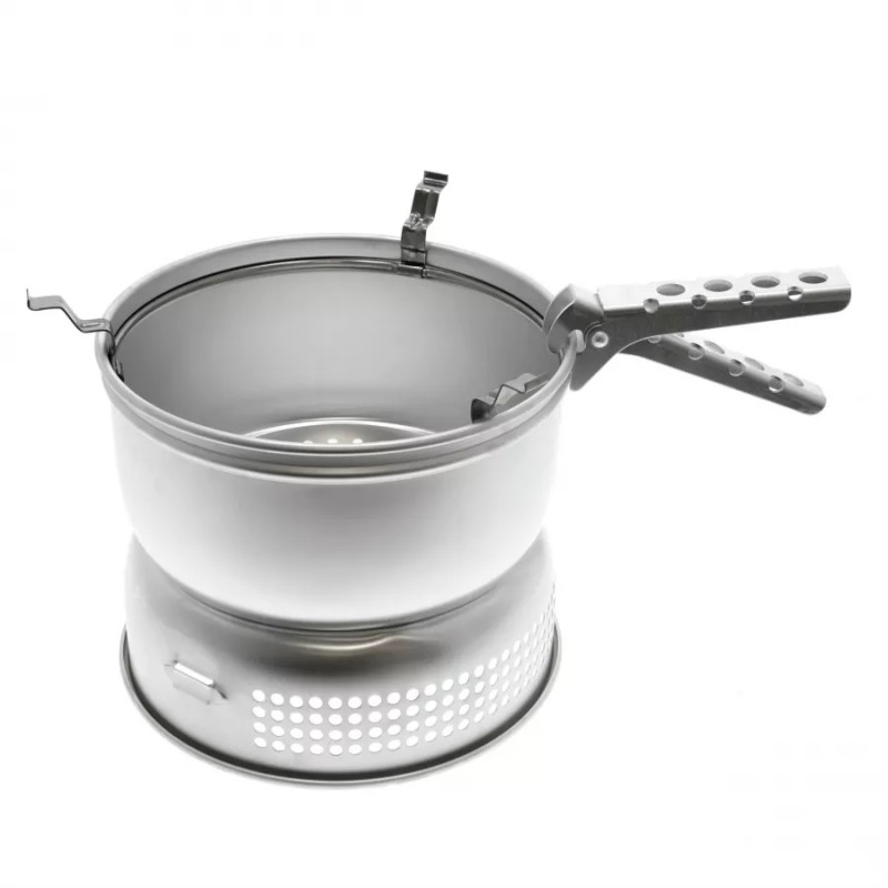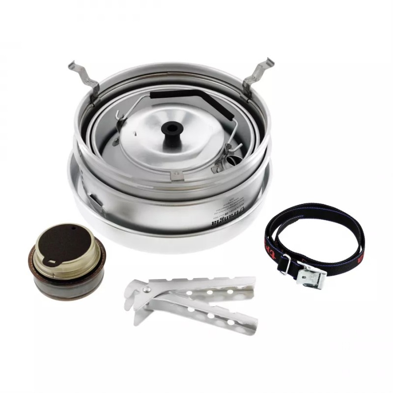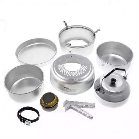 Model Trangia Stove 25 to zestaw dla grupy 3-4 osób, zawierający dwa garnki o pojemnościach 1,75 i 1,5 litra, patelnię, osłonę przeciwwiatrową, palnik, uchwyt i pasek. Zestaw wyposażono także w czajnik turystyczny o pojemności 0,9 litra oraz palnik spirytusowy.