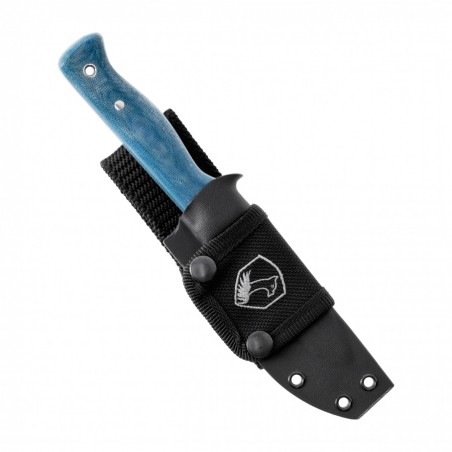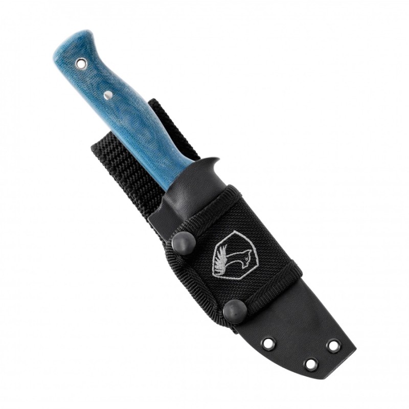 Nóż bushcraftowy Condor Aqualore ma profilowane okładziny z niebieskiej micarty mocowane do trzpienia mosiężnymi nitami. W tylnej części znajduję się otwór, który pozwala na mocowanie linki lub rzemienia. Do przenoszenia Condor Aqualore służy kydexowa pochewka o otwartej konstrukcji. Pochewka ma szeroką nylonową szlufkę, która umożliwia wygodne przenoszenie przy pasie podczas aktywności outdoorowej.