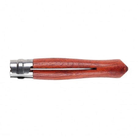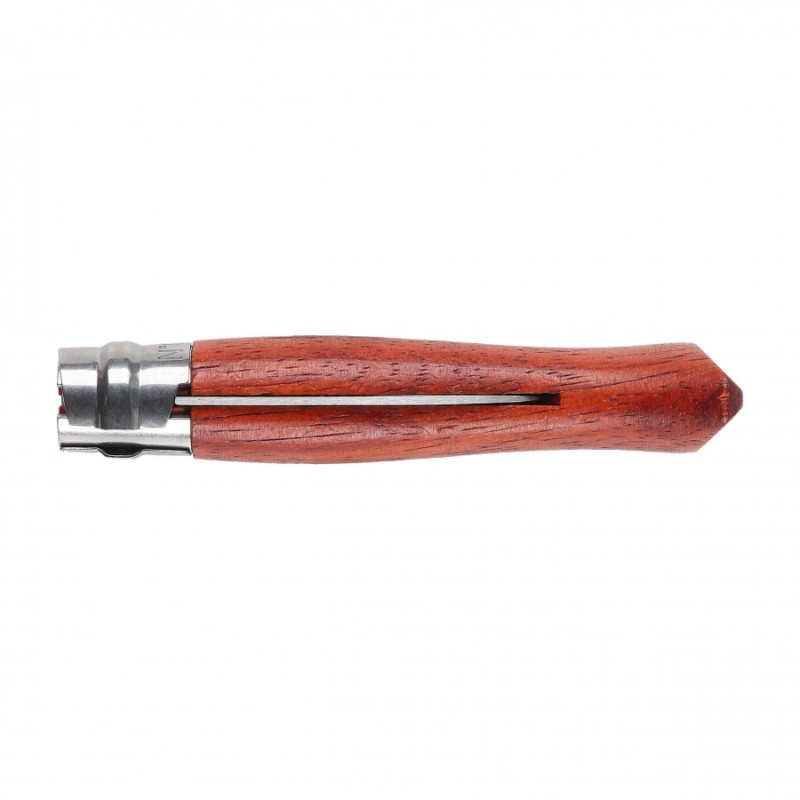 Rękojeść wykonana z egzotycznego drewna padouk doskonale układa się w dłoni, zapewniając stabilność i wygodę bez względu na warunki. Zabezpieczenie powierzchni lakierem chroni przed wilgocią i nadaje narzędziu elegancki wygląd. Dzięki systemowi blokady Virobloc możesz bez obaw operować nożem — mechanizm pewnie blokuje ostrze zarówno w pozycji otwartej, jak i zamkniętej, zwiększając bezpieczeństwo użytkowania.