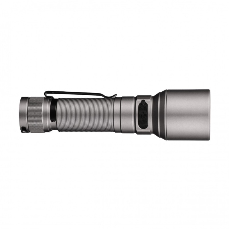 Fenix C7 zasilany jest za pomocą akumulatora 21700 o pojemności 5000 mAh. ARB-L21-5000U to obecnie najbardziej pojemne ogniwo do zasilania latarek, zapewniające znacznie dłuższą pracę oraz stałą wydajność prądową. Latarka ma system szybkiego ładowania za pomocą dyskretnie schowanego portu USB-C. To praktyczne i wygodne rozwiązanie umożliwia ładowanie ogniwa bez potrzeby korzystania z dodatkowej ładowarki. Wystarczy jedynie standardowy kabel USB-C oraz źródło prądu np. power bank, laptop, komputer stacjonarny lub samochodowa ładowarka z gniazdem USB. Latarka ze wbudowanym portem USB-C pozwala nie tylko zaoszczędzić pieniądze (na zakup ładowarki), przede wszystkim zapewnia wygodę oraz możliwość ładowania w dowolnym miejscu. Wysoki prąd ładowania 2A pozwala całkowicie naładować akumulator w zaledwie 3 godziny. Gniazdo jest odpowiednio zabezpieczone przed wodą, kurzem i zabrudzeniem za pomocą szczelnej silikonowej zatyczki.