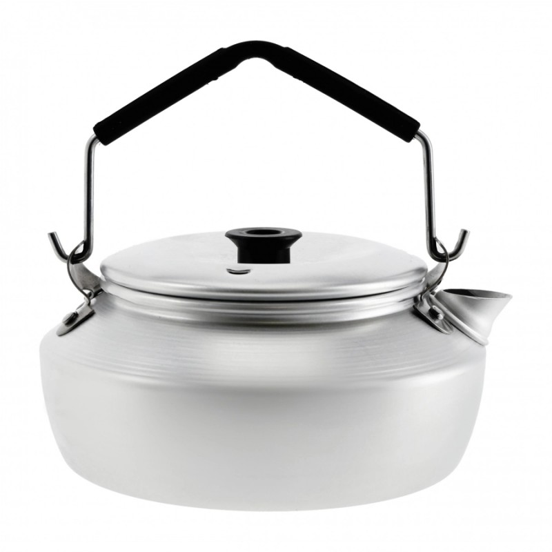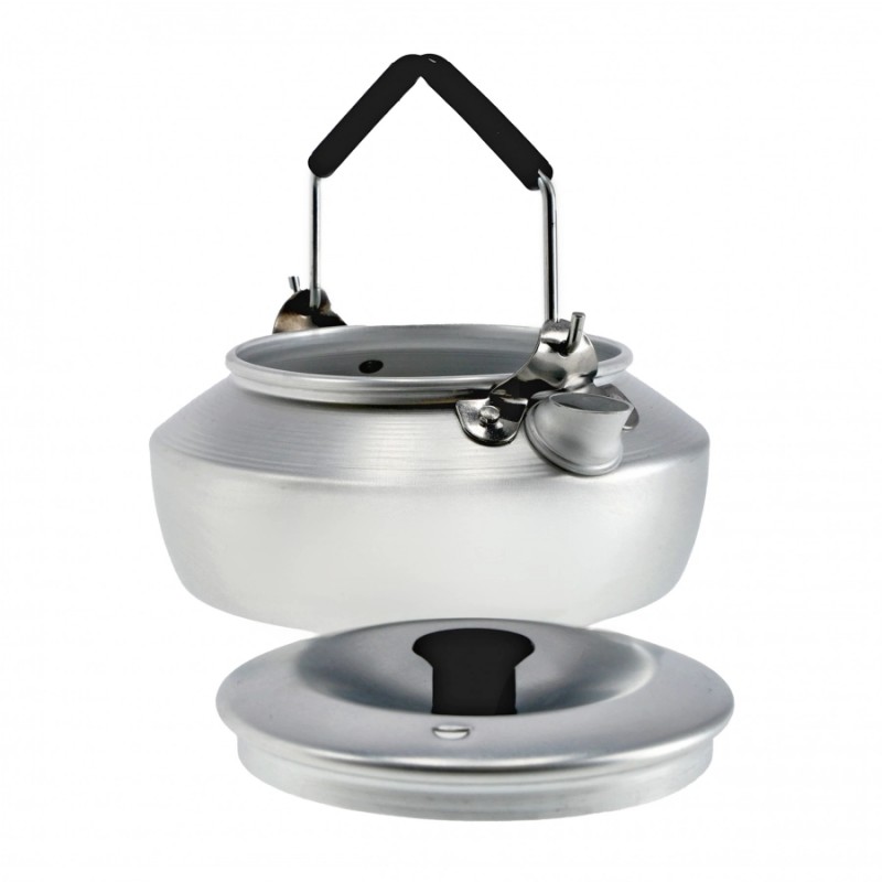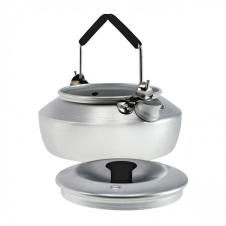 Aluminiowy czajnik turystyczny Trangia o pojemności 0,6 litra. Posiada składaną rączkę z demontowalnym uchwytem wykonanym z materiału syntetycznego oraz pokrywę z otworem umożliwiającym wypuszczanie pary. Izolowany uchwyt pozwala na zawieszenie czajnika nad ogniem.