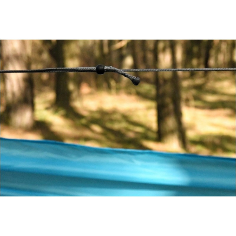 Sky Version to jednak nie tylko hamak, ale również wiele akcesoriów niezbędnych do jego wygodnego i szybkiego rozwieszenia. W ramach zestawu znajdziemy taśmy, które dzięki linii pętli gwarantują możliwość bezwęzłowego rozwieszenia oraz regulacji pozycji hamaka. Dołączone karabińczyki wykonane są z aluminium, a ich konstrukcja sprawia, że są w stanie utrzymać do 300 kg obciążenia – przewyższają zatem odpornością materiał hamaka, gwarantując tym bezpieczeństwo podczas snu. Umieszczone w zestawie linki whoopie sling umożliwią precyzyjną regulację naciągu oraz kąta nachylenia hamaka, natomiast cięciwa pozwoli na odpowiedni rozkład napięcia, sprawiając, że wypoczynek będzie jeszcze bardziej komfortowy.